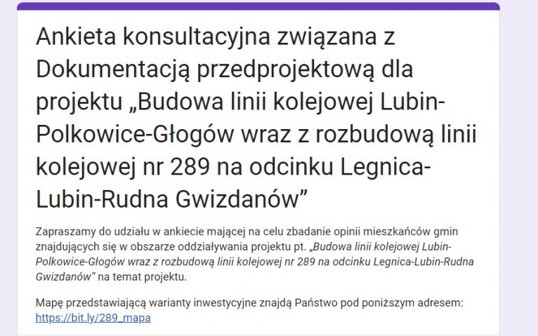 W sierpniu w Lubinie odbyło się spotkanie z mieszkańcami w tej sprawie, teraz przyszła kolej na ankiety. To następny element konsultacji społecznych i tworzenia dokumentacji dla budowy linii kolejowej Lubin – Polkowice – Głogów wraz z rozbudową linii kolejowej nr 289 na odcinku Legnica – Lubin – Rudna Gwizdanów.