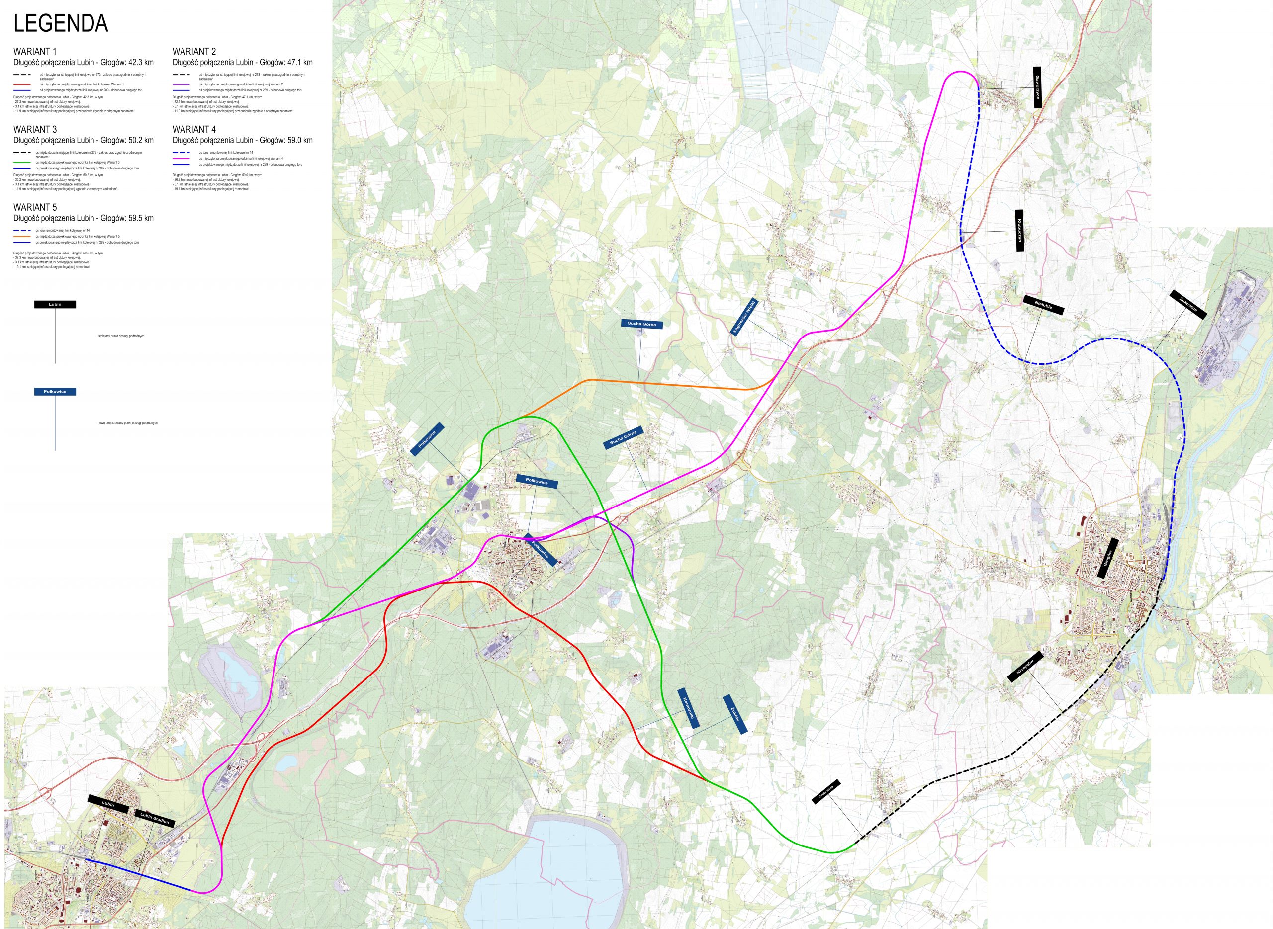 Na potrzeby konsultacji powstało pięć wstępnych wariantów poprowadzenia linii włączającej Polkowice w kolejową sieć. Układ przystanków w samym Lubinie nie zmieni się.