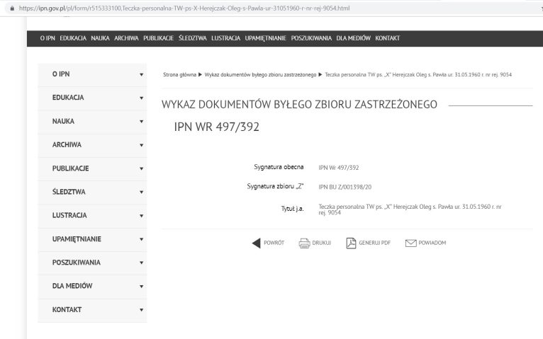 W archiwum IPN w internecie, a dokładnie w wykazie byłego zbioru zastrzeżonego można znaleźć informację, że radny Herejczak miał założoną teczkę personalną tajnego współpracownika o pseudonimie „X” (link tutaj). Nie znajdziemy w niej żadnych wpisów świadczących o tym, że lubinianin na kogoś donosił czy dostarczał SB jakieś informacje. Faktem jest jednak, że teczka zawiera podpisane jego imieniem i nazwiskiem oświadczenie, że Herejczak zobowiązuje się do „nieoficjalnego udzielania organom SB pomocy w zakresie ujawniania, przeciwdziałania i zwalczania wszelkich wrogich działań godzących w interes PRL”.