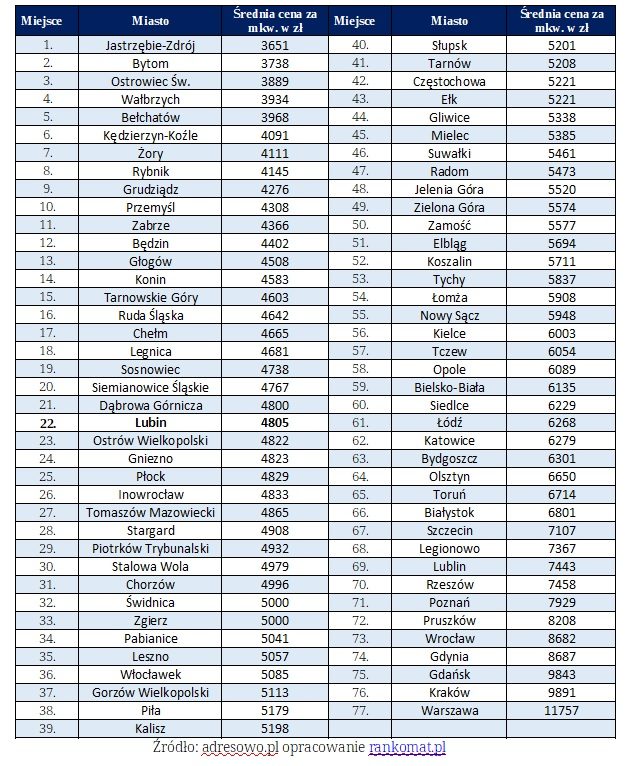 Ranking cen mieszkań. Na którym miejscu Lubin?