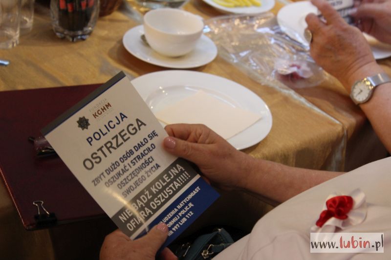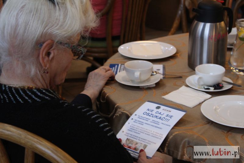 Policjantki zjawiły się, by przestrzec starsze osoby przed oszustami oraz przypomnieć seniorom o noszeniu odblasków. Funkcjonariuszki przechodziły między stolikami, rozmawiały z gośćmi i rozdawały ulotki.
