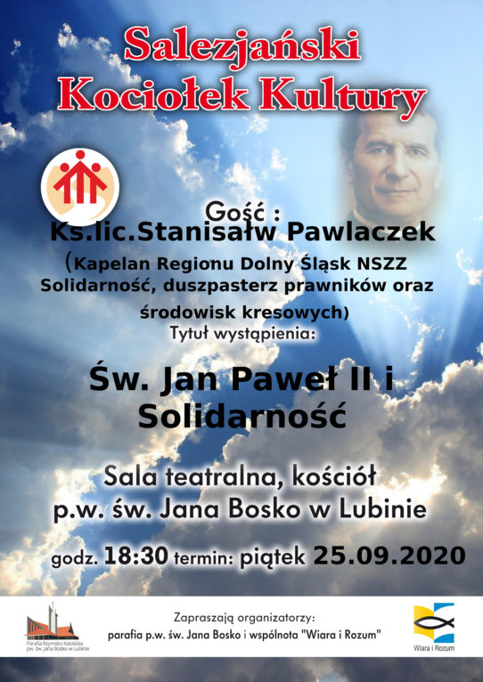 Już w najbliższy piątek, 25 września, o godz. 18.30 w sali teatralnej przy kościele św. Jana Bosko w Lubinie odbędzie się 78. spotkanie Kociołka. Tym razem gościem będzie ks. lic. Stanisław Pawlaczek, wieloletni wykładowca na Papieskim Fakultecie Teologicznym we Wrocławiu, kapelan Regionu Dolny Śląsk NSZZ Solidarność, duszpasterz prawników Archidiecezji Wrocławskiej i środowisk kresowych.