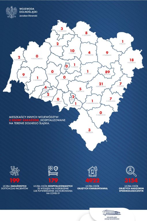 Na Dolnym Śląsku liczba zakażonych wzrosła do 214 (w tym są cztery osoby zmarłe). Dzisiaj przybyło 21 nowych przypadków. Nowo zdiagnozowane osoby pochodzą z Wrocławia, Wałbrzycha i Jeleniej Góry oraz powiatów kłodzkiego, wrocławskiego, jeleniogórskiego, zgorzeleckiego, oleśnickiego i milickiego. Łącznie w naszym województwie kwarantanną lub izolacją objętych jest 4922 osób, nadzorem epidemiologicznym – 3154, a w szpitalach z powodu podejrzenia zachorowania COVID-19 przebywa 179 pacjentów.