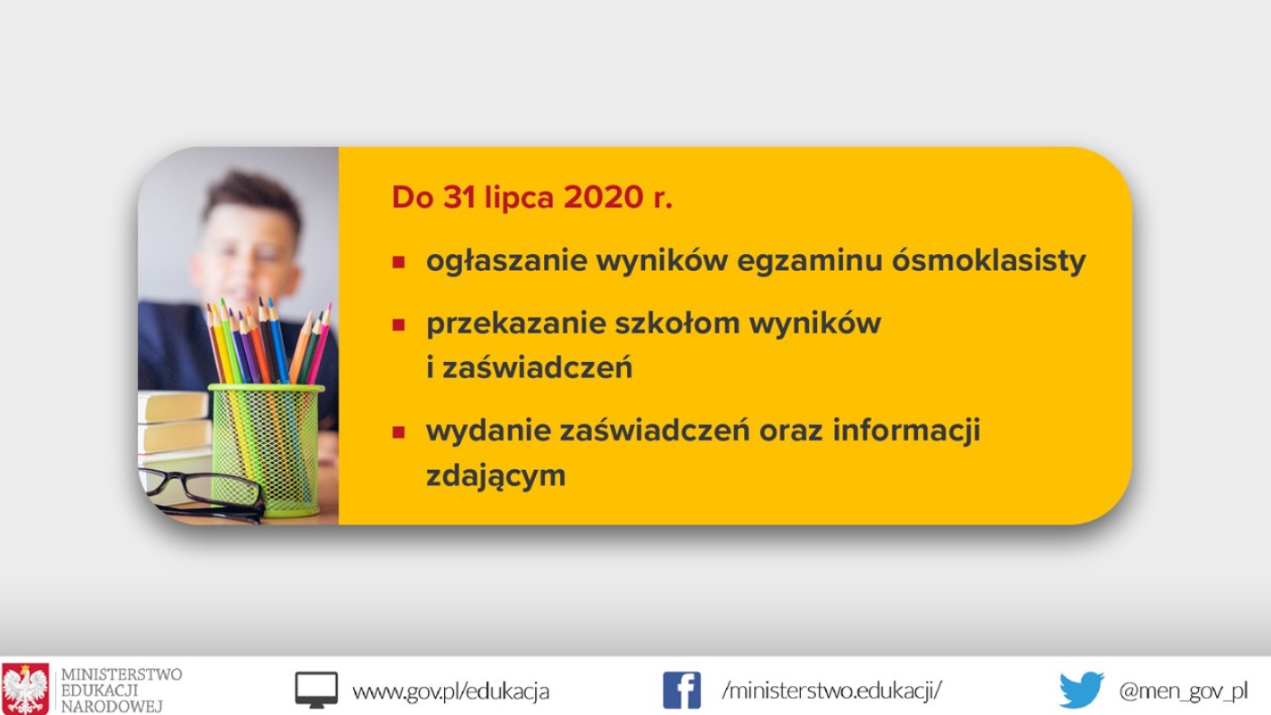 Jak już wiadomo od jakiegoś czasu, egzamin ósmoklasisty odbędzie się między 16 a 18 czerwca, a wyniki uczniowie poznają pod koniec lipca.