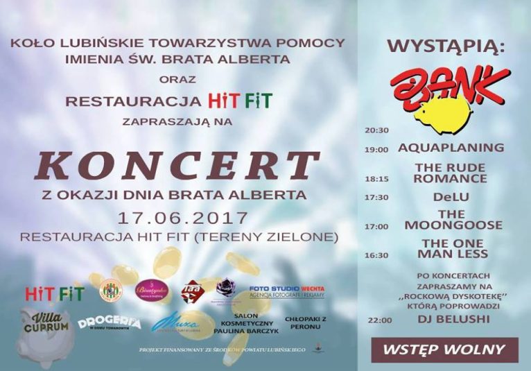 W sobotę, o godzinie 16. 30 na terenach zielonych przy restauracji HIT FIT rozpocznie się koncert z okazji święta Brata Alberta. Zagra m.in. sławny w latach 80. zespół BANK, a także dobrze znane mieszkańcom lokalne zespoły: The One Man Less, The Moongoose, DeLu, The Rude Romance oraz Aquaplaning.