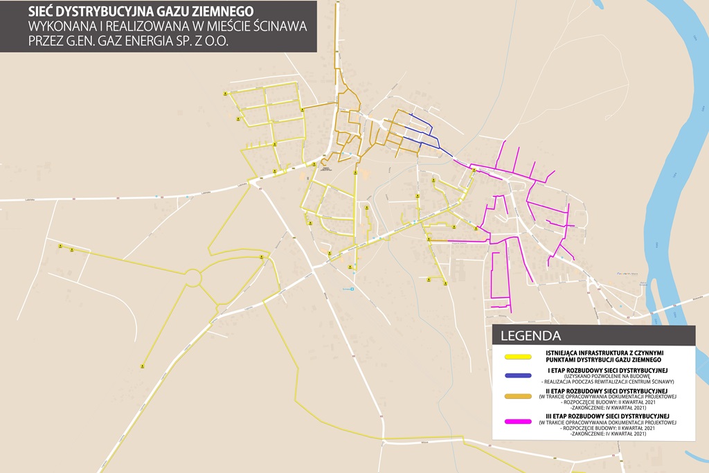 Dzięki dotychczasowym działaniom sieć dystrybucyjna gazu ziemnego w samej Ścinawie wybudowana jest już w obrębach ulic: Legnickiej, Wita Stwosza, Spacerowej, Lubińskiej od nr 13 do 24, Ogrodowej, Akacjowej, Topolowej, Cisowej, Klonowej, Hożej, Różanej, Kilińskiego, Słowackiego, Reymonta, Kościuszki od nr 5 do 39a, Władysława Jagiełły, Królowej Jadwigi od nr 1 do 14, Lipowej od 1 do 10, Paderewskiego od 1 do 8, Chopina od nr 1 do 12.