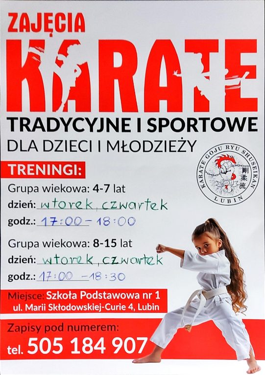 – Jest to bardzo bezpieczny i mało kontuzjogenny sport. Dla dzieci przewidziane są formy konkurencji zupełnie bezkontaktowe z udziałem fantoma. Szczerze polecam. Poza tym karate, jak większość sportów walki, kształtuje charakter i dyscyplinę – zachęca sensei Zbigniew Dziubek, instruktor Karate Goju Ryu Shuseikan Lubin. Klub prowadzi nabór na zajęcia dla dzieci i młodzieży.