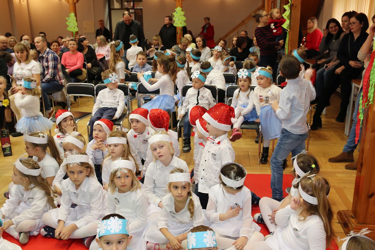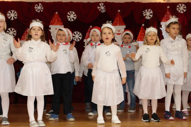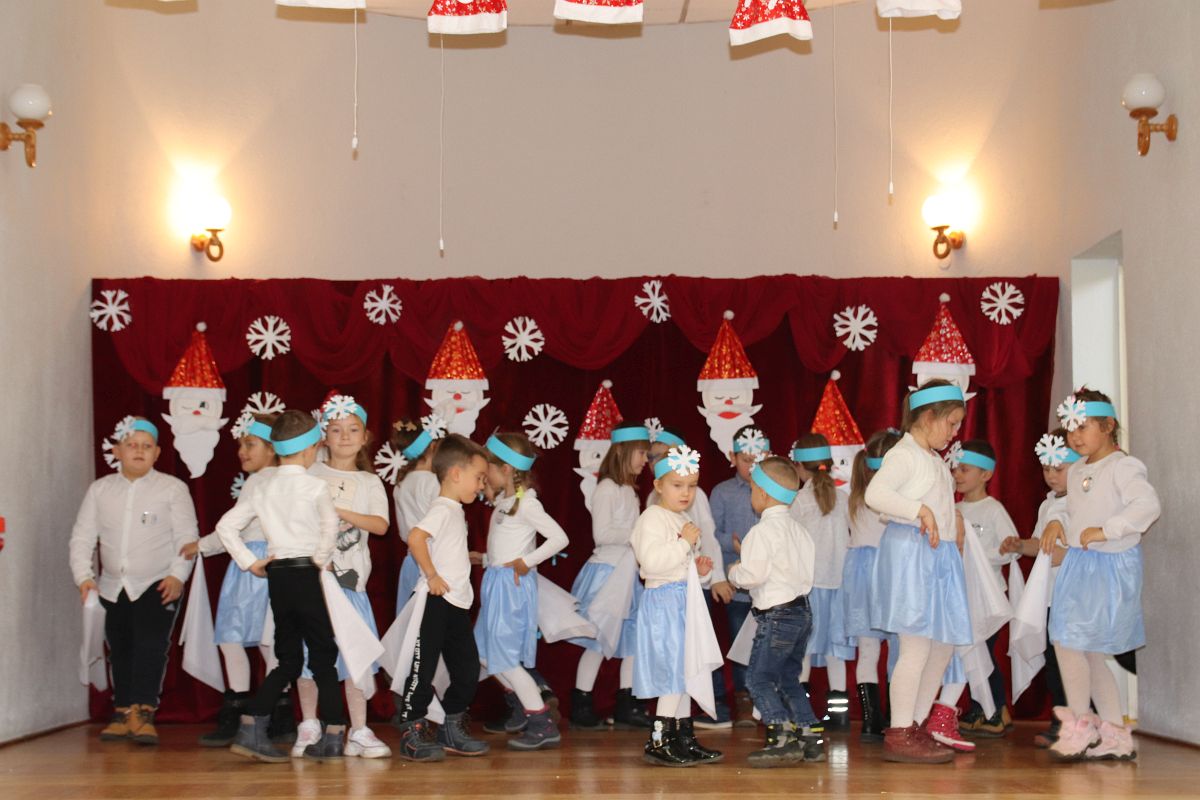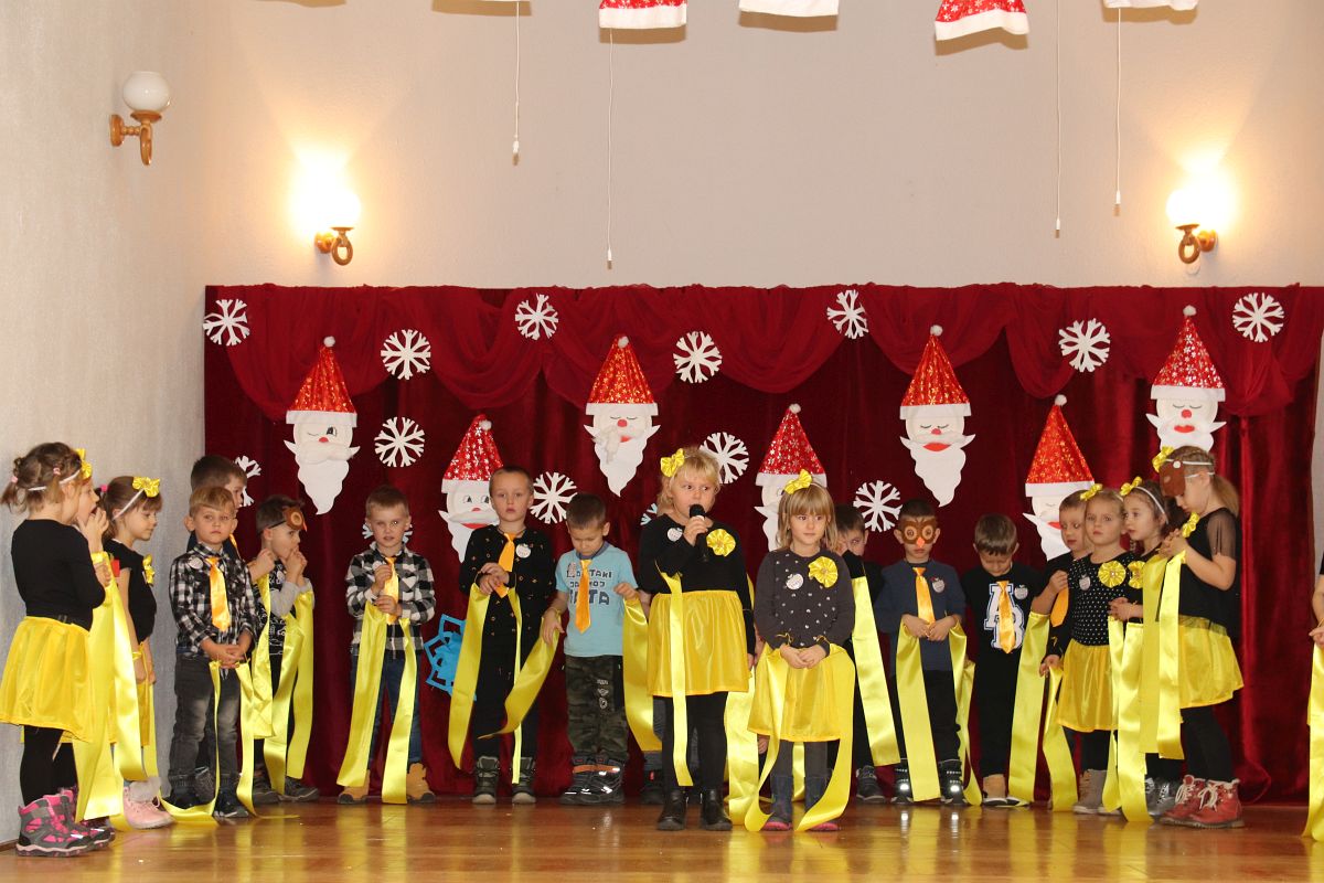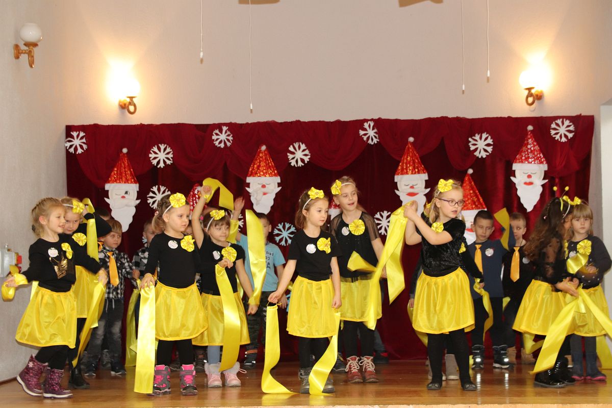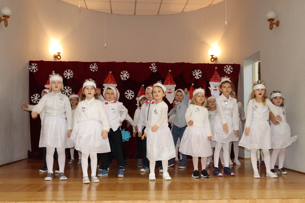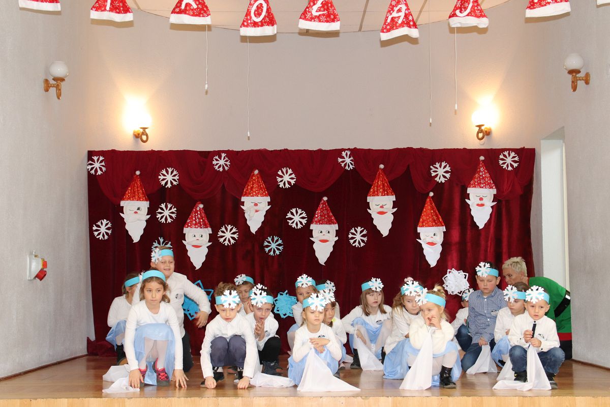 Jako pierwsza wystąpiła grupa „Misie” 2,5-, 3-latków pod kierunkiem Katarzyny Sochy i Agaty Dykta. Dzieci zaprezentowały się nam w montażu śpiewno-muzycznym: „Zimowa piosenka” i „Taniec śnieżynek”. Druga w kolejności wystąpiła grupa „Żabki” 3-latki pod kierunkiem Justyny Wawrzyniak i Agaty Dykta w piosenkach zatytułowanych „Elfy” i „Muzyczne stop”. Grupa „Sówki” były to 4-latki pod kierunkiem Agaty Musielskiej i Magdaleny Czachara. „Sówki” zaprezentowały się w utworach: „ Taniec białych dni” i „Jezus się narodził”. Natomiast Małgorzata Mały i Magdalena Czachara wraz z grupą „Słoneczka” 5-latków zaprezentowała się w tańcu i piosence pod wspólną nazwą „Dzień Bożego Narodzenia”. Grupa „Kotki”, pod kierunkiem Weroniki Iwanickiej i Eweliny Lajter zaśpiewała – piosenki „Święta”, „Hallelujah”oraz „Przyszła zima”. Natomiast grupa „Motylki” pod kierunkiem Moniki Leciejewskiej i Weroniki Iwanickiej zaprezentowała się w piosence i tańcu: „Płatki śniegu” i „Zimowa pałeczka”.