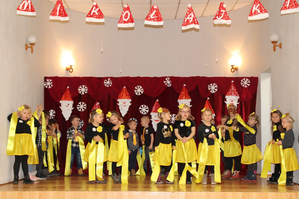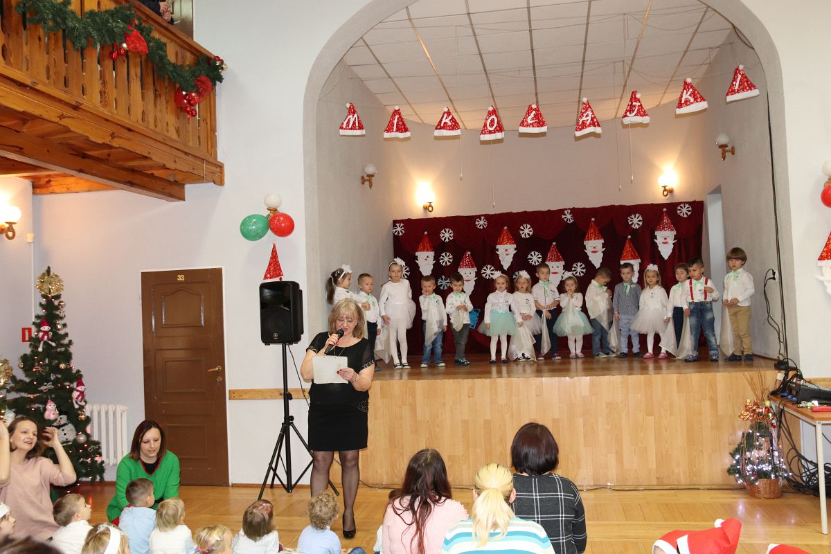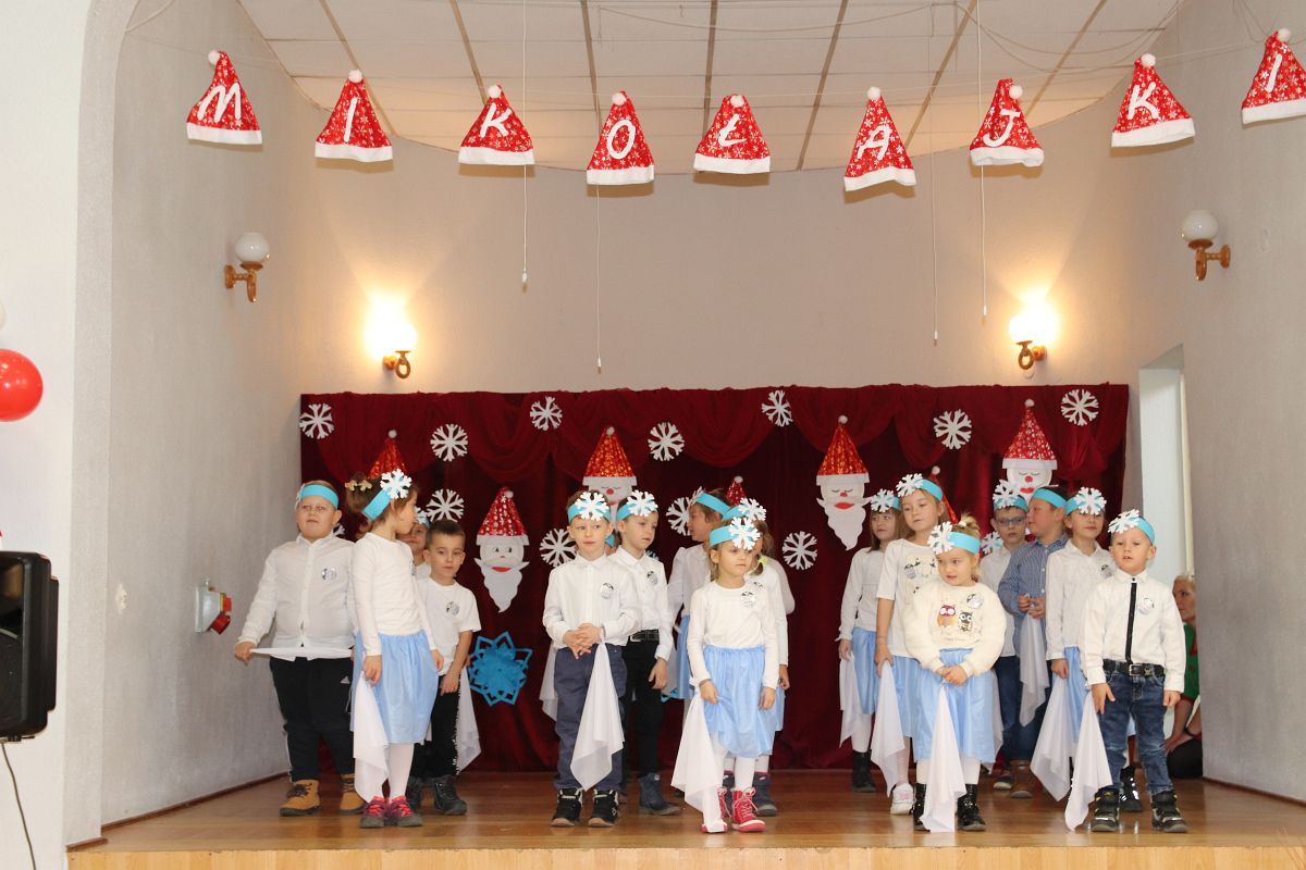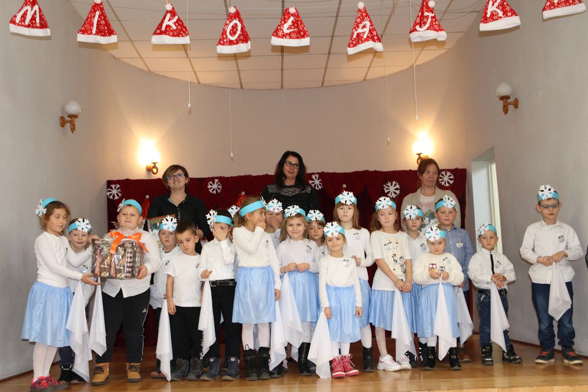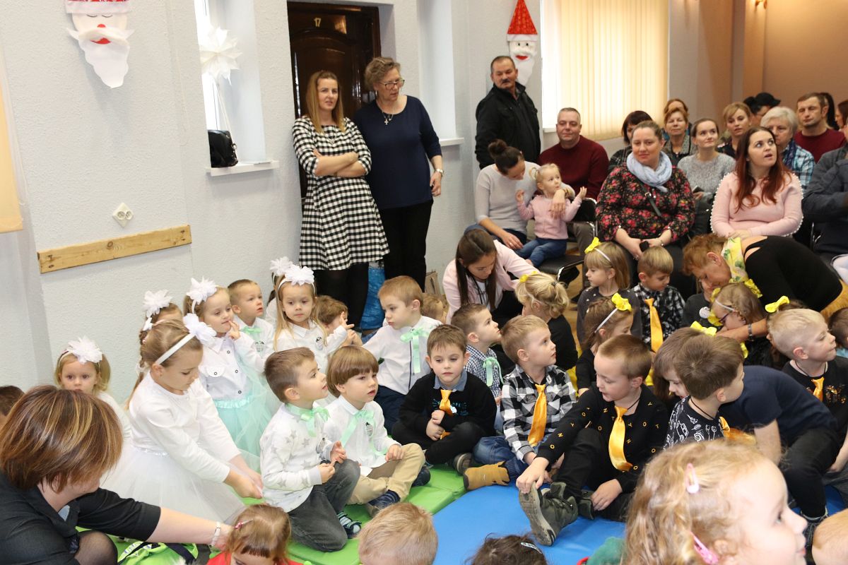 Jako pierwsza wystąpiła grupa „Misie” 2,5-, 3-latków pod kierunkiem Katarzyny Sochy i Agaty Dykta. Dzieci zaprezentowały się nam w montażu śpiewno-muzycznym: „Zimowa piosenka” i „Taniec śnieżynek”. Druga w kolejności wystąpiła grupa „Żabki” 3-latki pod kierunkiem Justyny Wawrzyniak i Agaty Dykta w piosenkach zatytułowanych „Elfy” i „Muzyczne stop”. Grupa „Sówki” były to 4-latki pod kierunkiem Agaty Musielskiej i Magdaleny Czachara. „Sówki” zaprezentowały się w utworach: „ Taniec białych dni” i „Jezus się narodził”. Natomiast Małgorzata Mały i Magdalena Czachara wraz z grupą „Słoneczka” 5-latków zaprezentowała się w tańcu i piosence pod wspólną nazwą „Dzień Bożego Narodzenia”. Grupa „Kotki”, pod kierunkiem Weroniki Iwanickiej i Eweliny Lajter zaśpiewała – piosenki „Święta”, „Hallelujah”oraz „Przyszła zima”. Natomiast grupa „Motylki” pod kierunkiem Moniki Leciejewskiej i Weroniki Iwanickiej zaprezentowała się w piosence i tańcu: „Płatki śniegu” i „Zimowa pałeczka”.