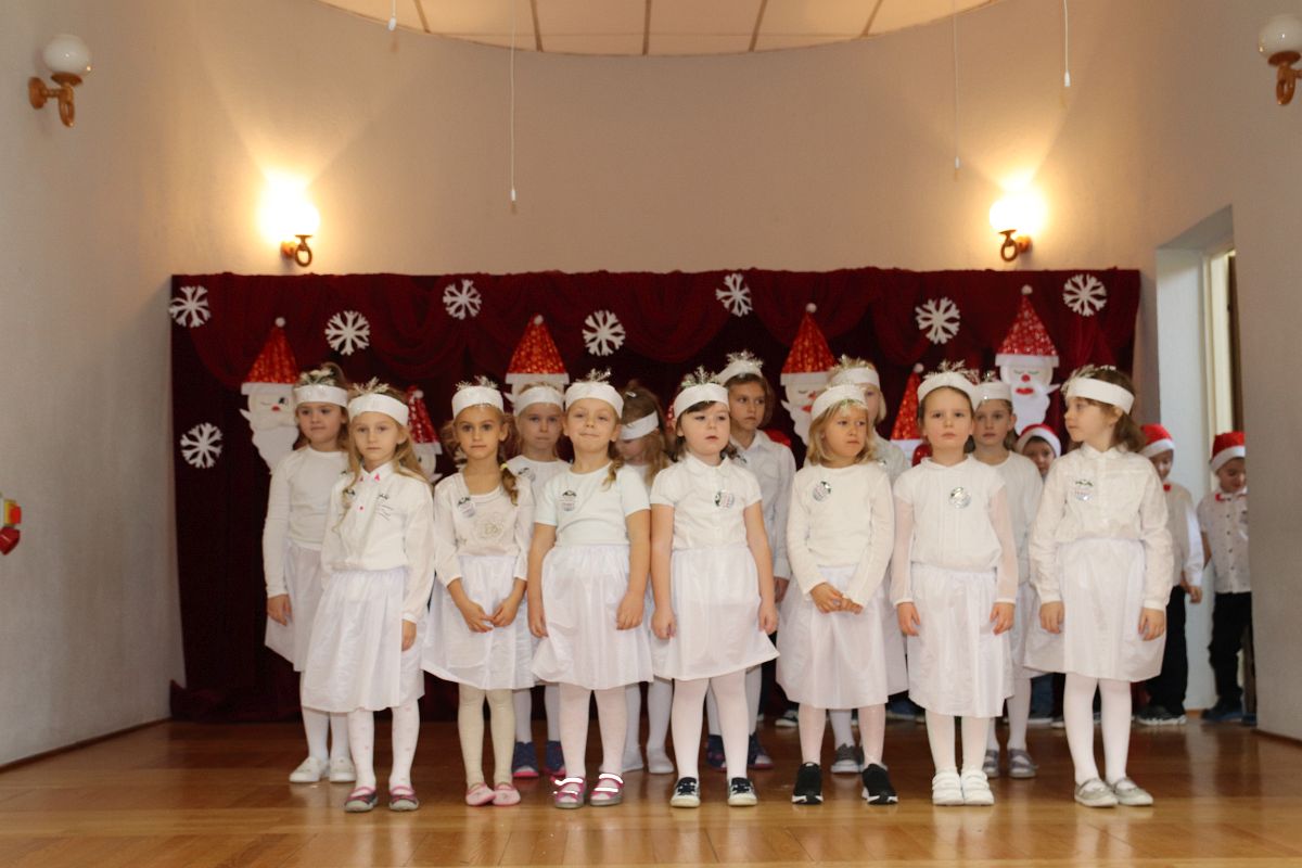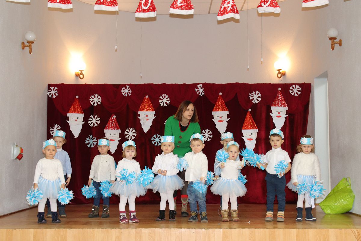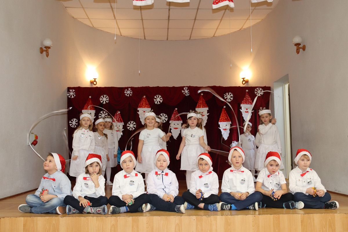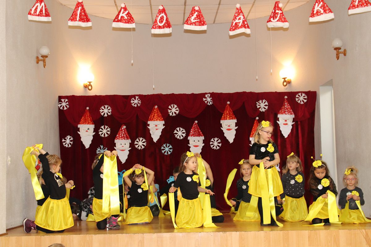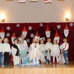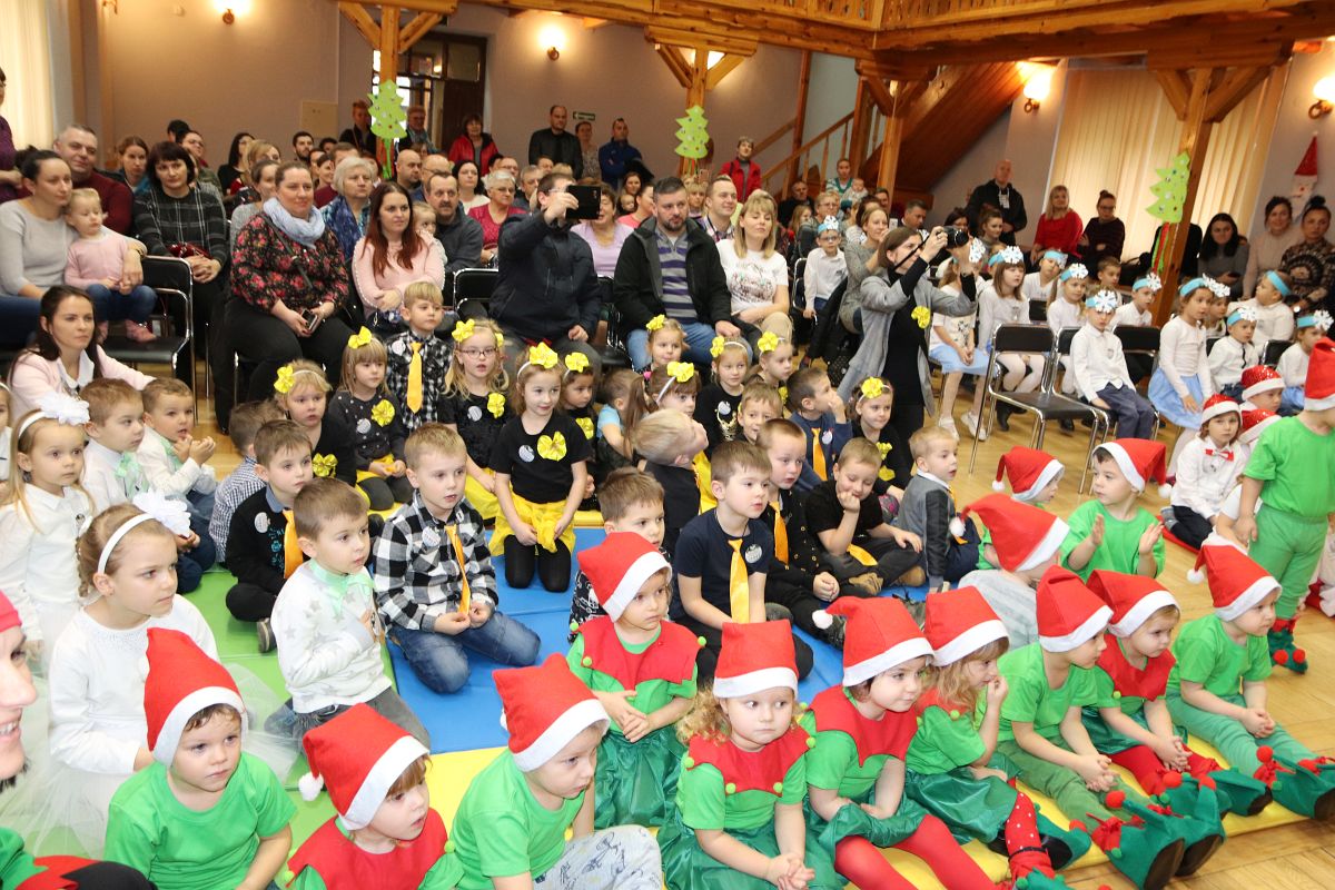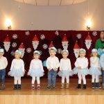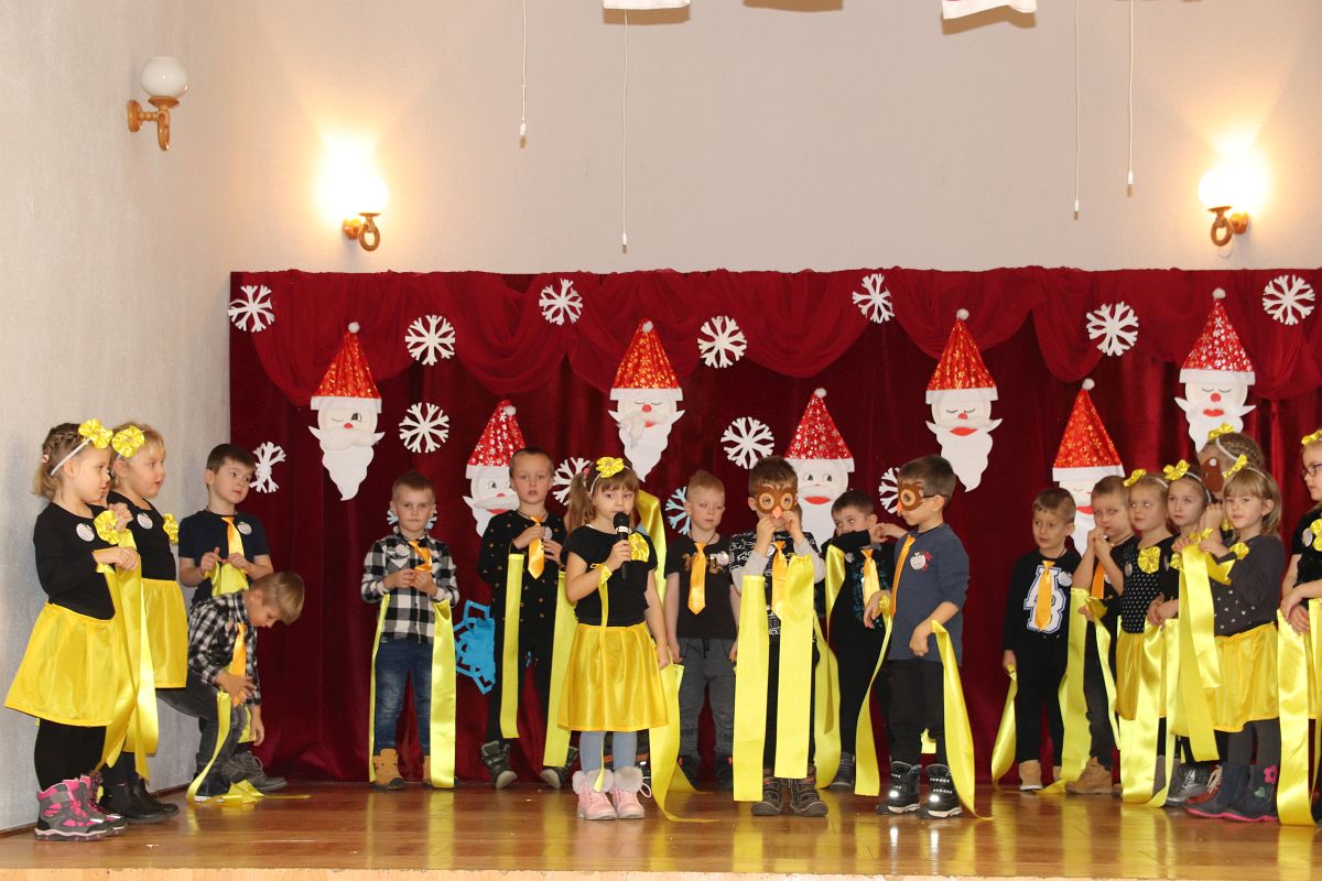 Jako pierwsza wystąpiła grupa „Misie” 2,5-, 3-latków pod kierunkiem Katarzyny Sochy i Agaty Dykta. Dzieci zaprezentowały się nam w montażu śpiewno-muzycznym: „Zimowa piosenka” i „Taniec śnieżynek”. Druga w kolejności wystąpiła grupa „Żabki” 3-latki pod kierunkiem Justyny Wawrzyniak i Agaty Dykta w piosenkach zatytułowanych „Elfy” i „Muzyczne stop”. Grupa „Sówki” były to 4-latki pod kierunkiem Agaty Musielskiej i Magdaleny Czachara. „Sówki” zaprezentowały się w utworach: „ Taniec białych dni” i „Jezus się narodził”. Natomiast Małgorzata Mały i Magdalena Czachara wraz z grupą „Słoneczka” 5-latków zaprezentowała się w tańcu i piosence pod wspólną nazwą „Dzień Bożego Narodzenia”. Grupa „Kotki”, pod kierunkiem Weroniki Iwanickiej i Eweliny Lajter zaśpiewała – piosenki „Święta”, „Hallelujah”oraz „Przyszła zima”. Natomiast grupa „Motylki” pod kierunkiem Moniki Leciejewskiej i Weroniki Iwanickiej zaprezentowała się w piosence i tańcu: „Płatki śniegu” i „Zimowa pałeczka”.