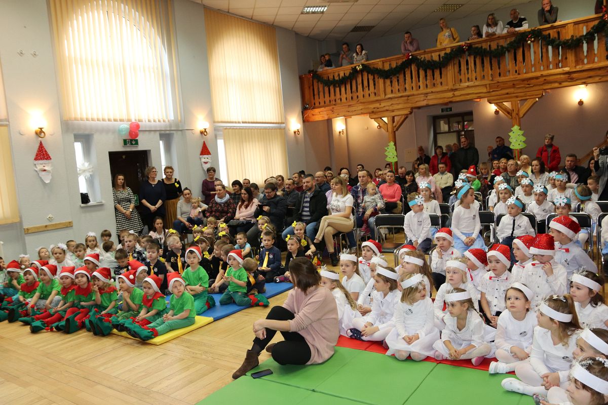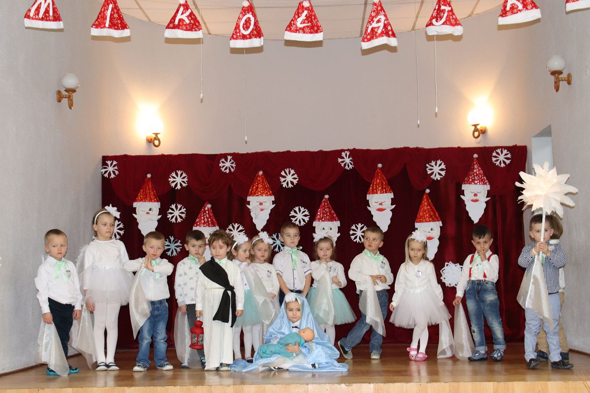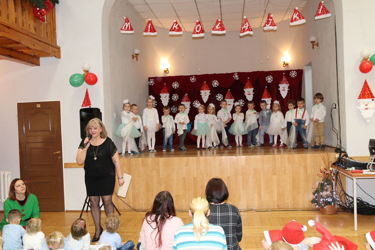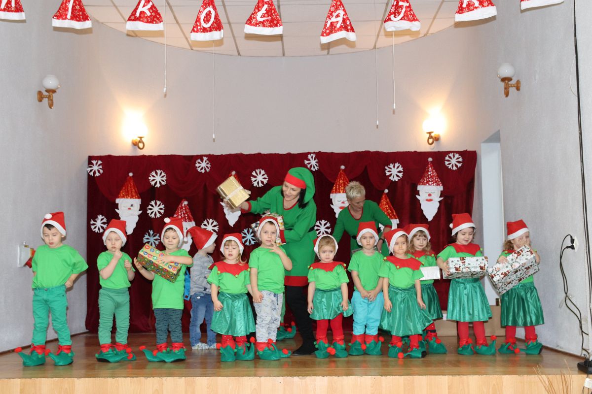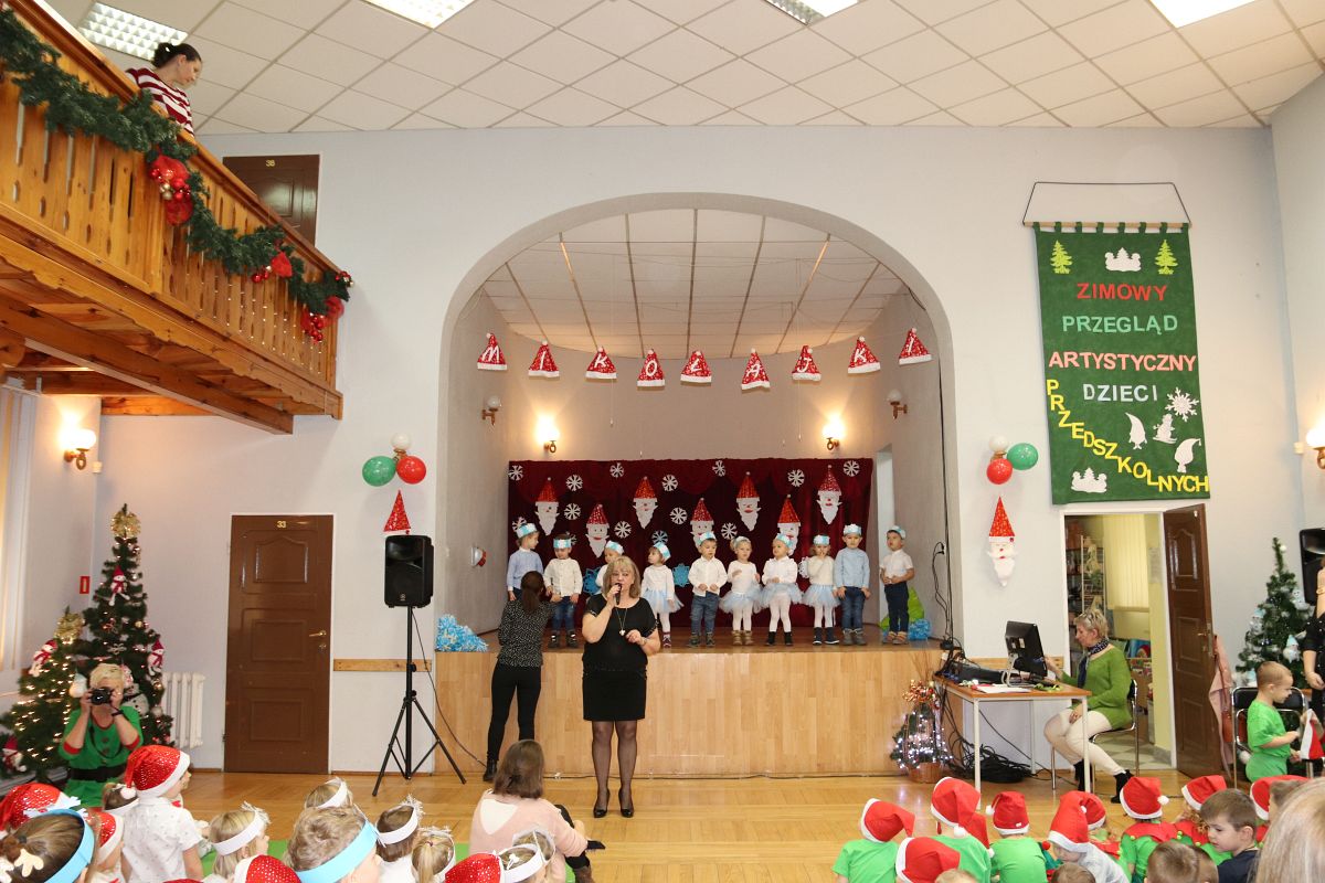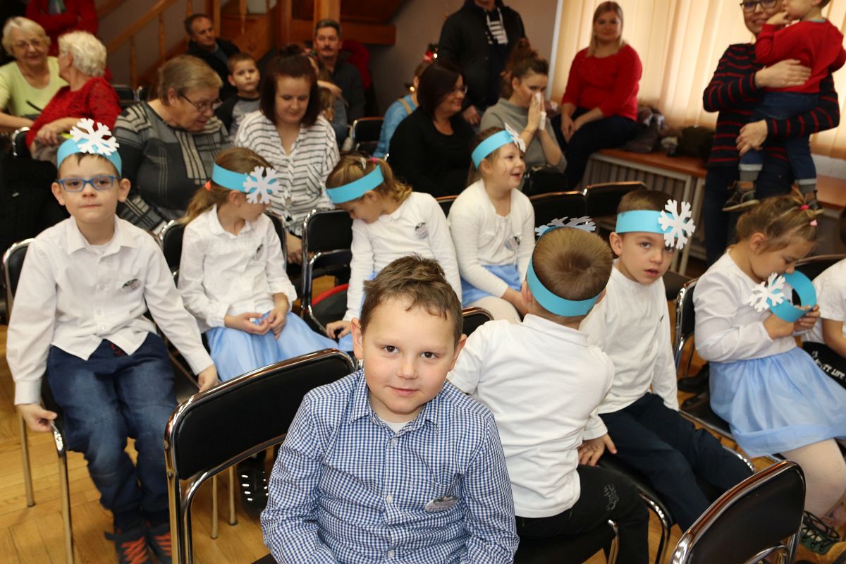 Jako pierwsza wystąpiła grupa „Misie” 2,5-, 3-latków pod kierunkiem Katarzyny Sochy i Agaty Dykta. Dzieci zaprezentowały się nam w montażu śpiewno-muzycznym: „Zimowa piosenka” i „Taniec śnieżynek”. Druga w kolejności wystąpiła grupa „Żabki” 3-latki pod kierunkiem Justyny Wawrzyniak i Agaty Dykta w piosenkach zatytułowanych „Elfy” i „Muzyczne stop”. Grupa „Sówki” były to 4-latki pod kierunkiem Agaty Musielskiej i Magdaleny Czachara. „Sówki” zaprezentowały się w utworach: „ Taniec białych dni” i „Jezus się narodził”. Natomiast Małgorzata Mały i Magdalena Czachara wraz z grupą „Słoneczka” 5-latków zaprezentowała się w tańcu i piosence pod wspólną nazwą „Dzień Bożego Narodzenia”. Grupa „Kotki”, pod kierunkiem Weroniki Iwanickiej i Eweliny Lajter zaśpiewała – piosenki „Święta”, „Hallelujah”oraz „Przyszła zima”. Natomiast grupa „Motylki” pod kierunkiem Moniki Leciejewskiej i Weroniki Iwanickiej zaprezentowała się w piosence i tańcu: „Płatki śniegu” i „Zimowa pałeczka”.