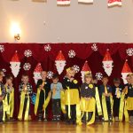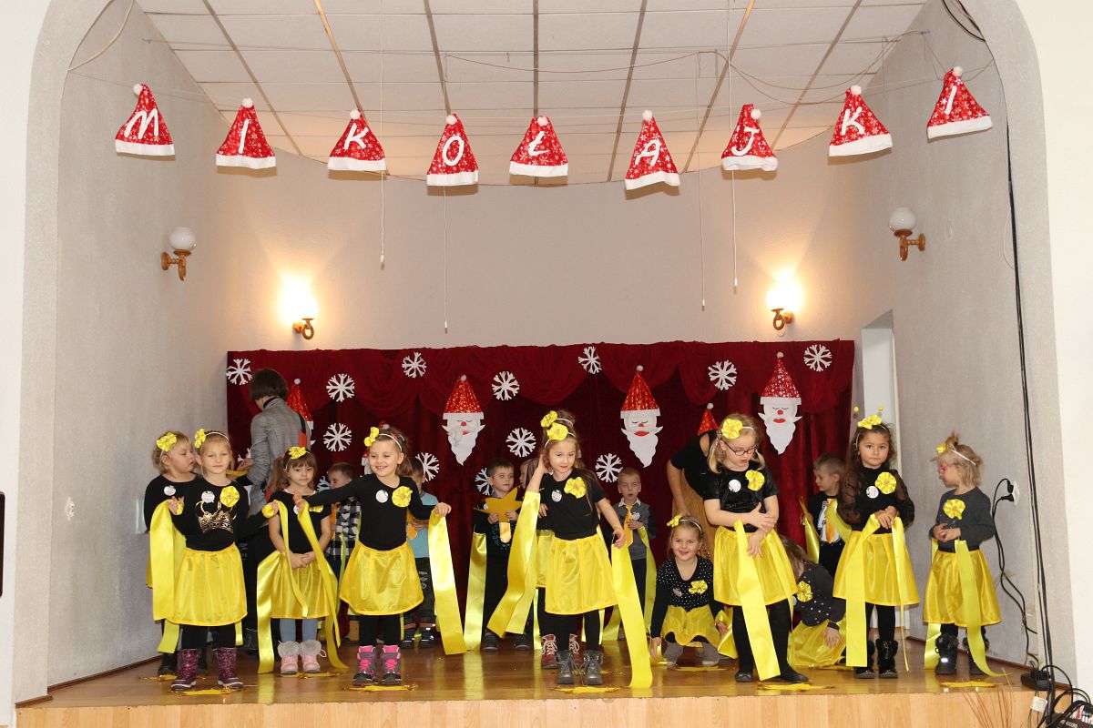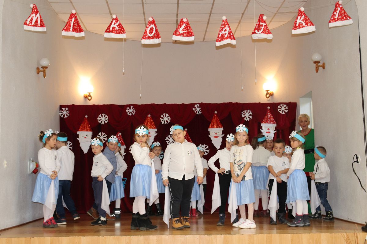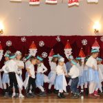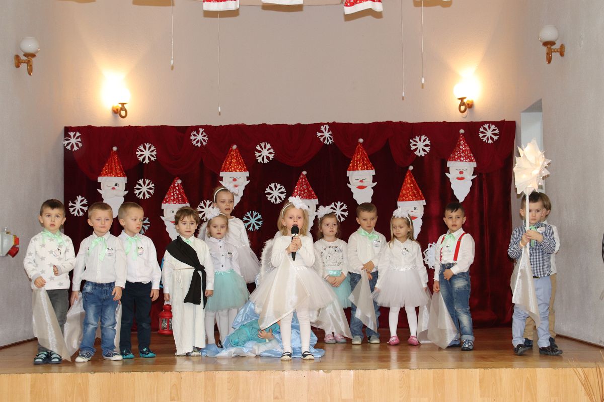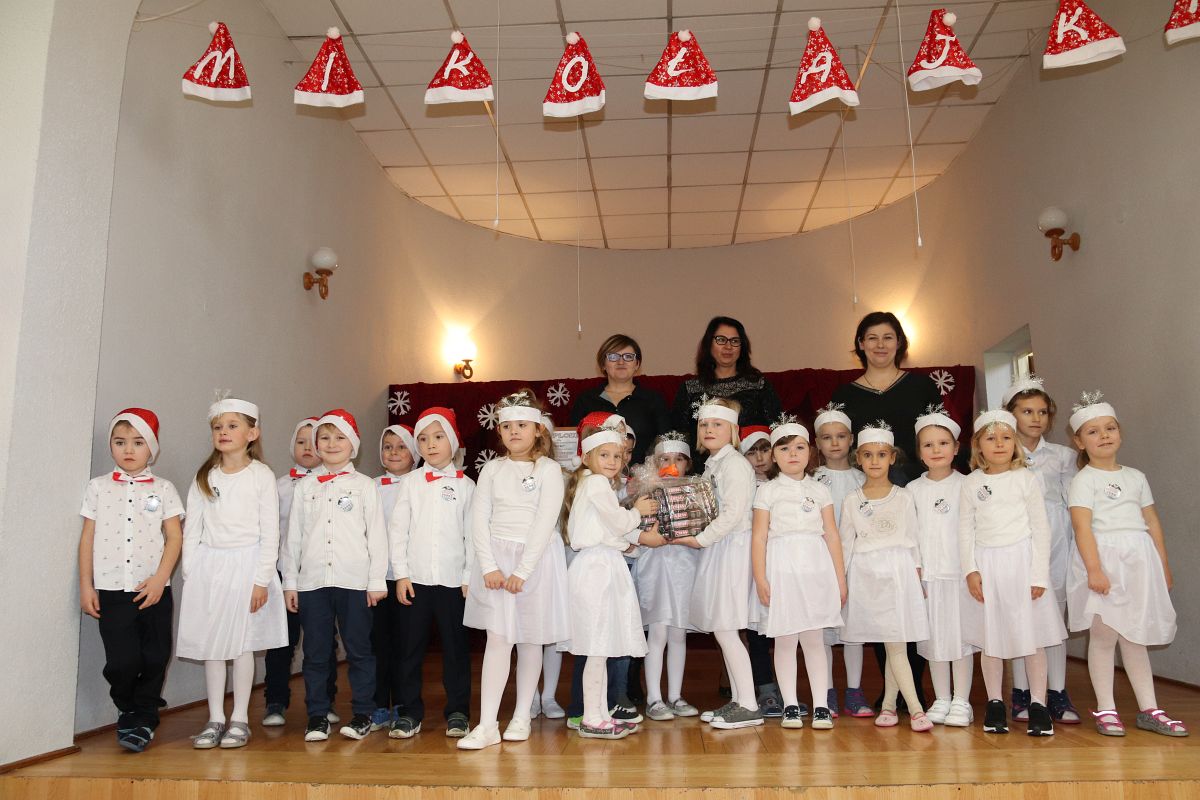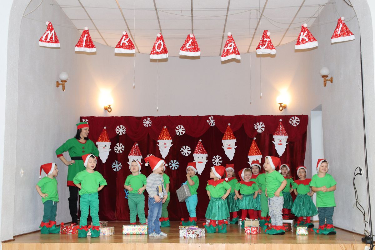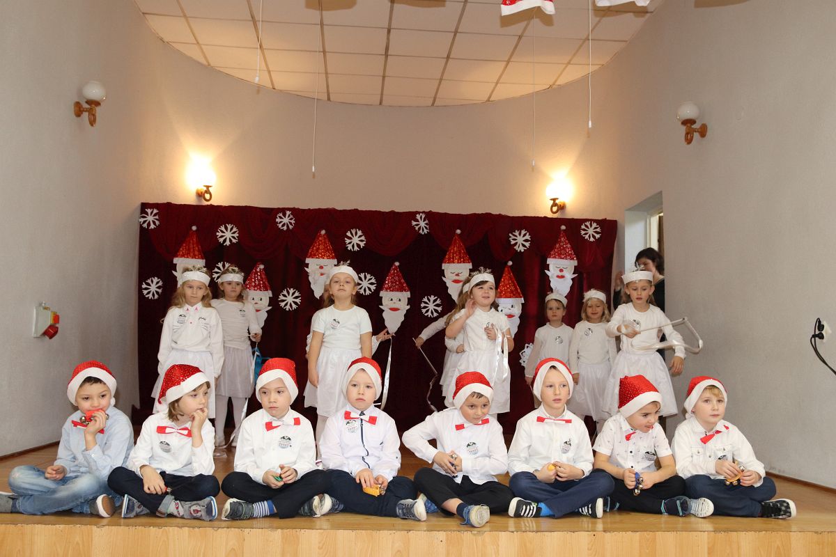 Jako pierwsza wystąpiła grupa „Misie” 2,5-, 3-latków pod kierunkiem Katarzyny Sochy i Agaty Dykta. Dzieci zaprezentowały się nam w montażu śpiewno-muzycznym: „Zimowa piosenka” i „Taniec śnieżynek”. Druga w kolejności wystąpiła grupa „Żabki” 3-latki pod kierunkiem Justyny Wawrzyniak i Agaty Dykta w piosenkach zatytułowanych „Elfy” i „Muzyczne stop”. Grupa „Sówki” były to 4-latki pod kierunkiem Agaty Musielskiej i Magdaleny Czachara. „Sówki” zaprezentowały się w utworach: „ Taniec białych dni” i „Jezus się narodził”. Natomiast Małgorzata Mały i Magdalena Czachara wraz z grupą „Słoneczka” 5-latków zaprezentowała się w tańcu i piosence pod wspólną nazwą „Dzień Bożego Narodzenia”. Grupa „Kotki”, pod kierunkiem Weroniki Iwanickiej i Eweliny Lajter zaśpiewała – piosenki „Święta”, „Hallelujah”oraz „Przyszła zima”. Natomiast grupa „Motylki” pod kierunkiem Moniki Leciejewskiej i Weroniki Iwanickiej zaprezentowała się w piosence i tańcu: „Płatki śniegu” i „Zimowa pałeczka”.