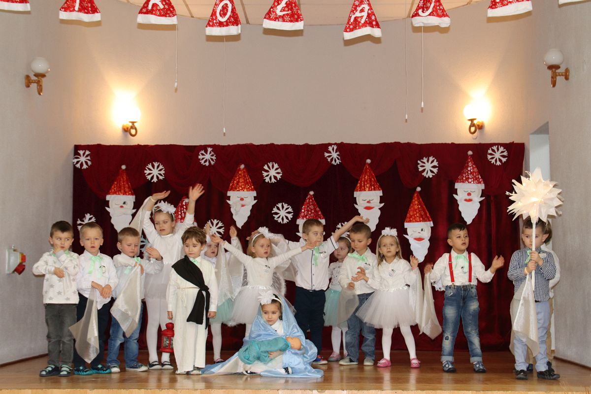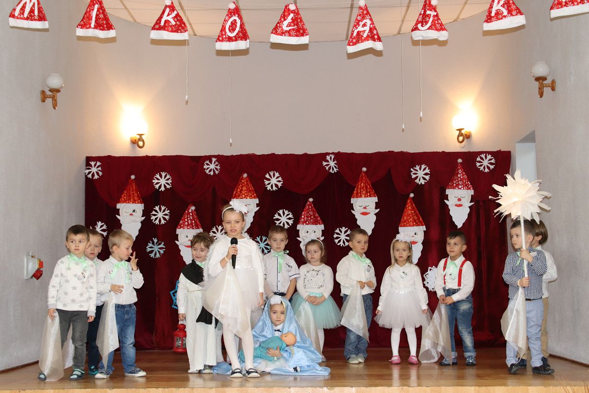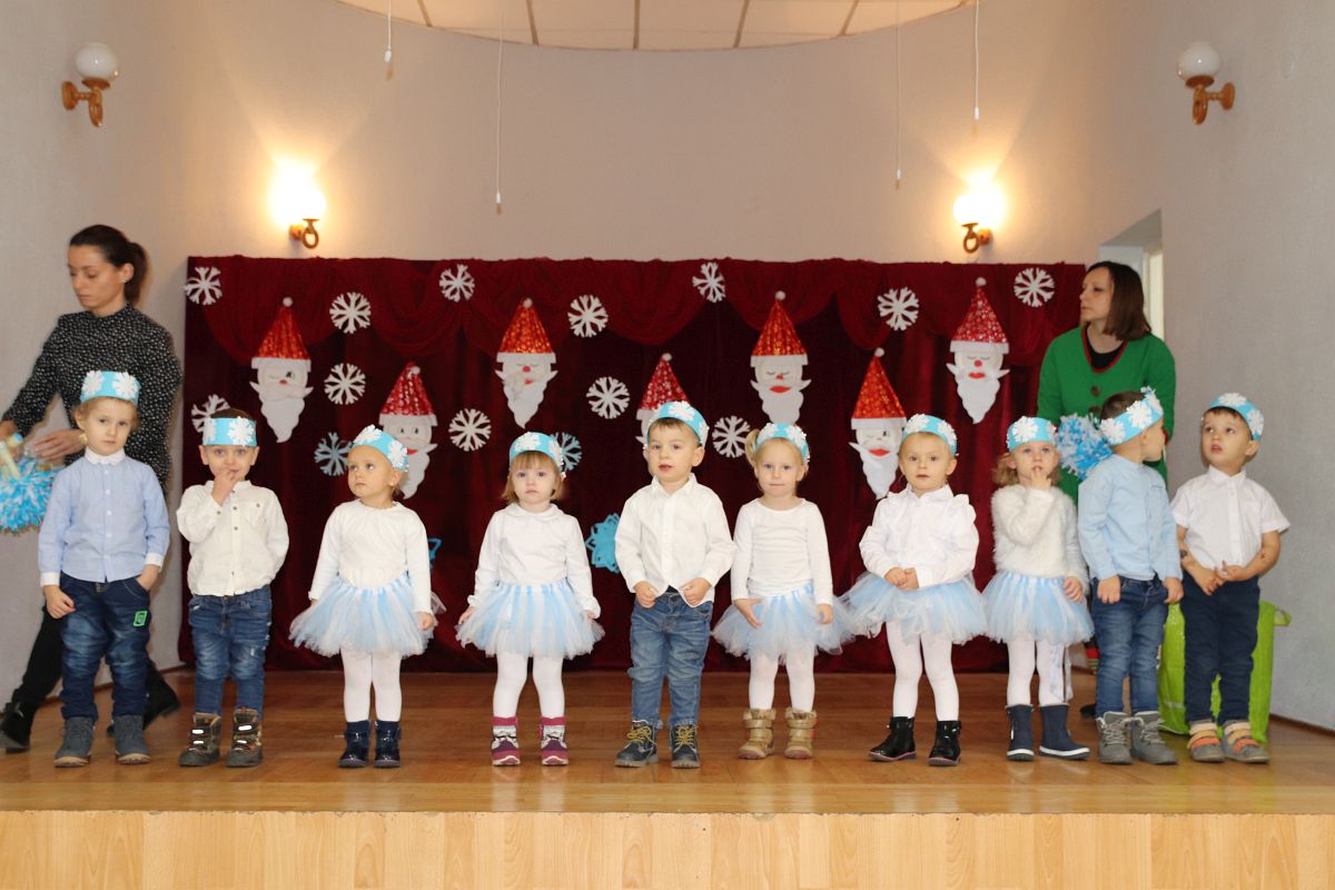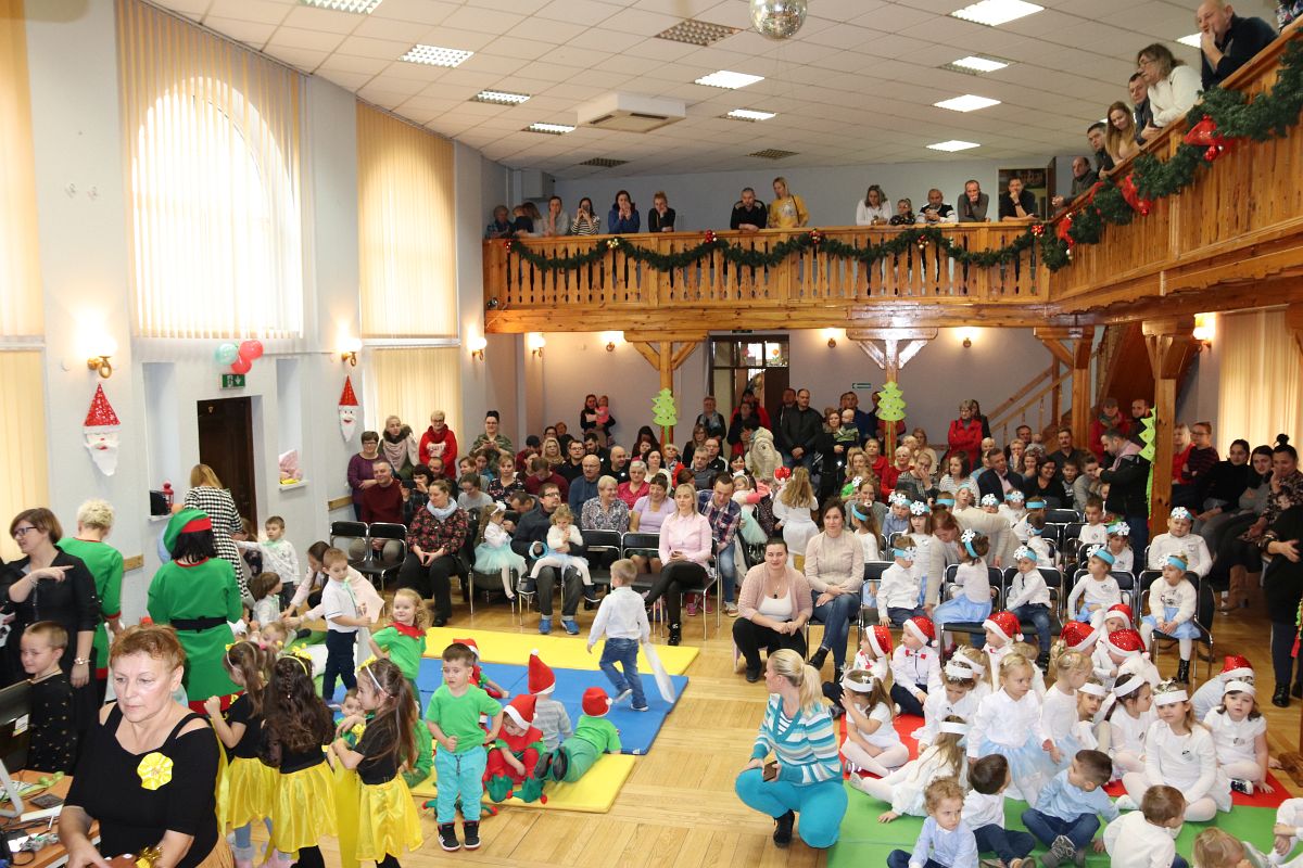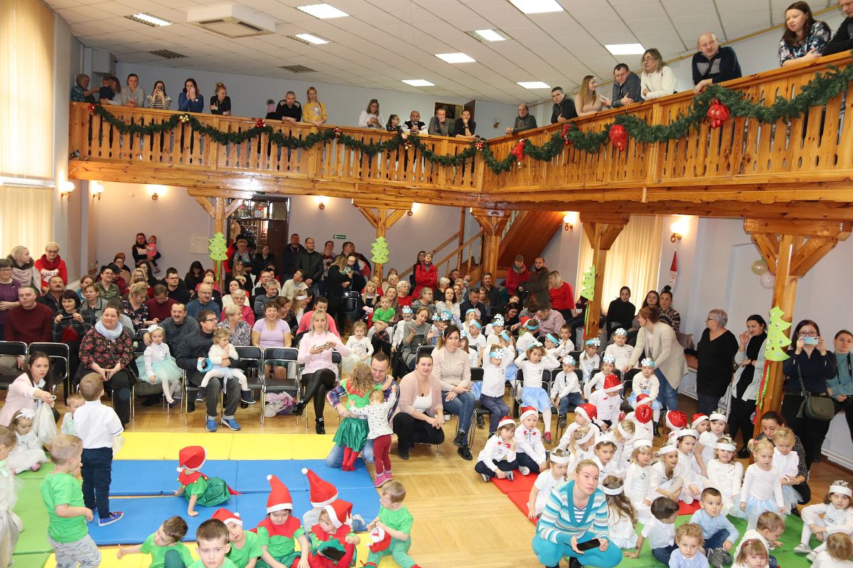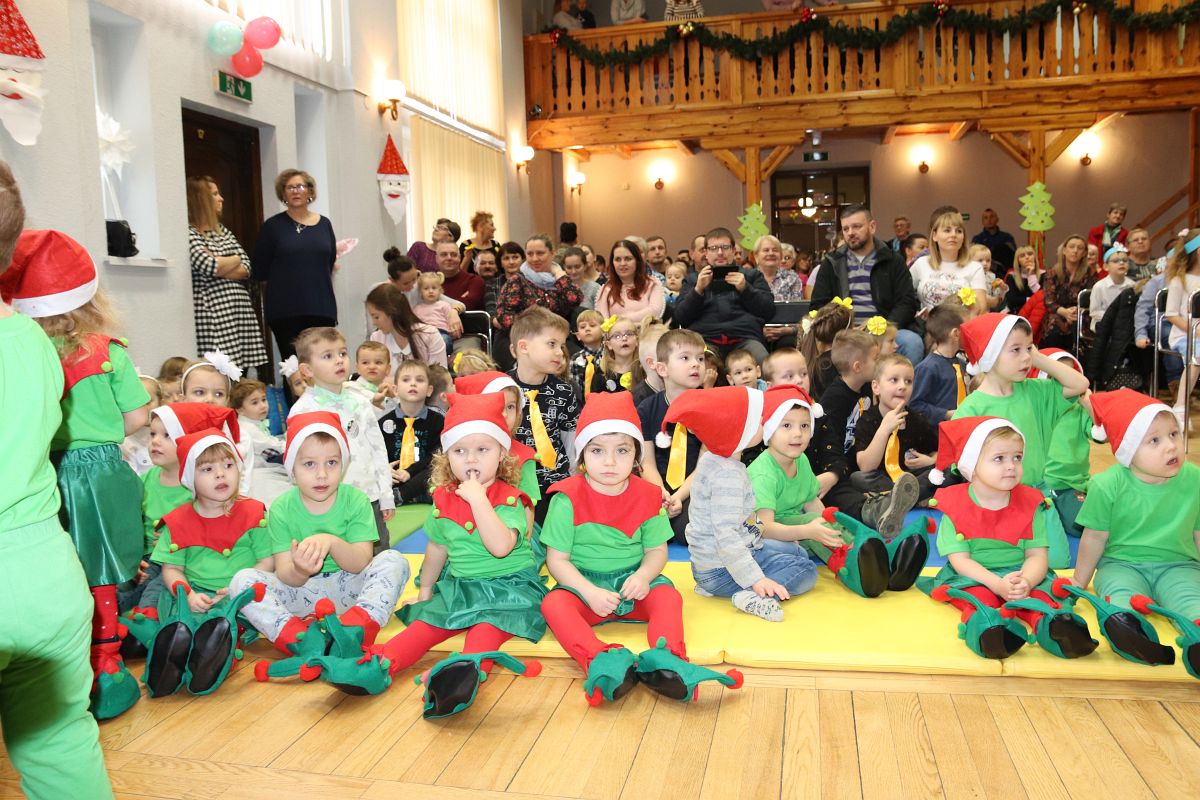 Jako pierwsza wystąpiła grupa „Misie” 2,5-, 3-latków pod kierunkiem Katarzyny Sochy i Agaty Dykta. Dzieci zaprezentowały się nam w montażu śpiewno-muzycznym: „Zimowa piosenka” i „Taniec śnieżynek”. Druga w kolejności wystąpiła grupa „Żabki” 3-latki pod kierunkiem Justyny Wawrzyniak i Agaty Dykta w piosenkach zatytułowanych „Elfy” i „Muzyczne stop”. Grupa „Sówki” były to 4-latki pod kierunkiem Agaty Musielskiej i Magdaleny Czachara. „Sówki” zaprezentowały się w utworach: „ Taniec białych dni” i „Jezus się narodził”. Natomiast Małgorzata Mały i Magdalena Czachara wraz z grupą „Słoneczka” 5-latków zaprezentowała się w tańcu i piosence pod wspólną nazwą „Dzień Bożego Narodzenia”. Grupa „Kotki”, pod kierunkiem Weroniki Iwanickiej i Eweliny Lajter zaśpiewała – piosenki „Święta”, „Hallelujah”oraz „Przyszła zima”. Natomiast grupa „Motylki” pod kierunkiem Moniki Leciejewskiej i Weroniki Iwanickiej zaprezentowała się w piosence i tańcu: „Płatki śniegu” i „Zimowa pałeczka”.