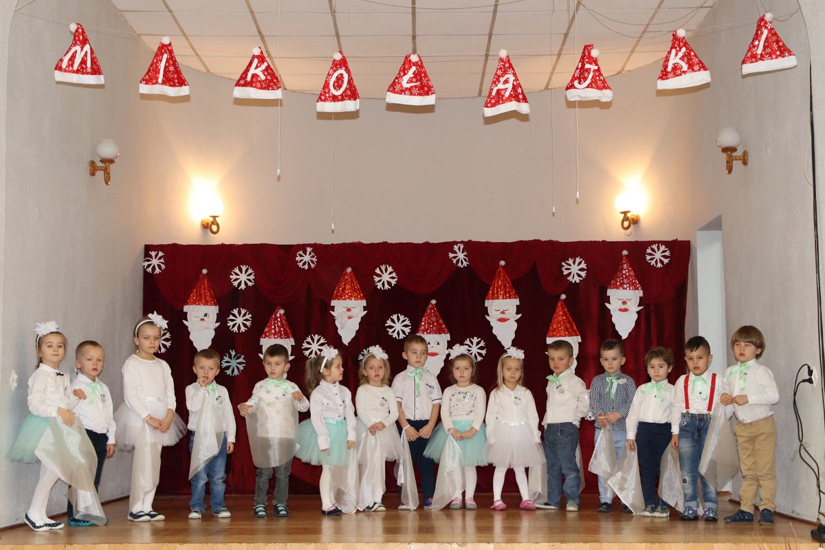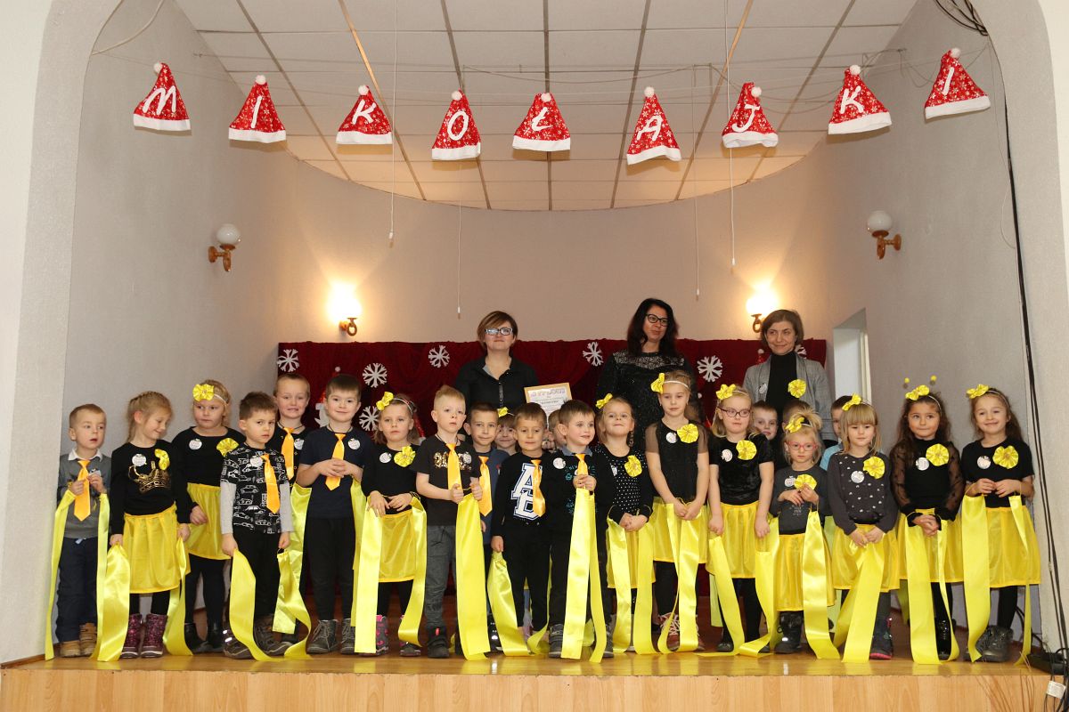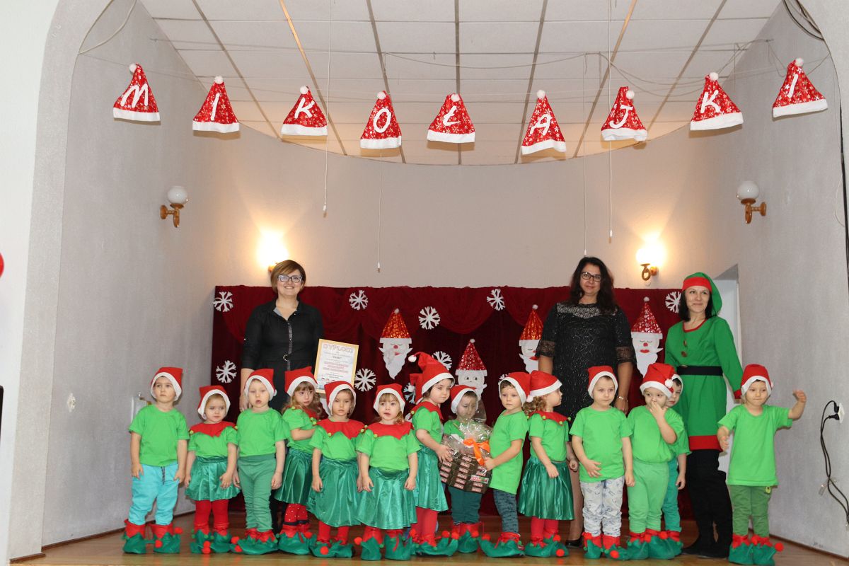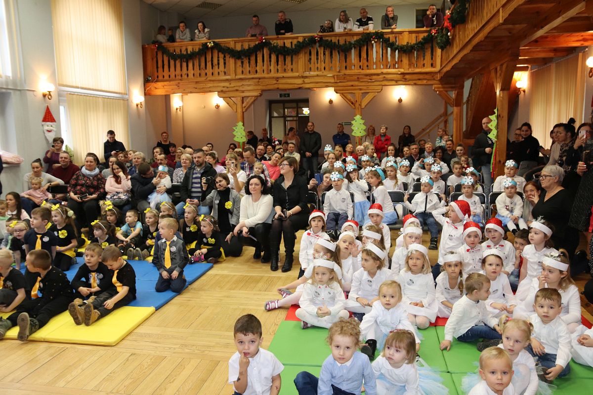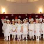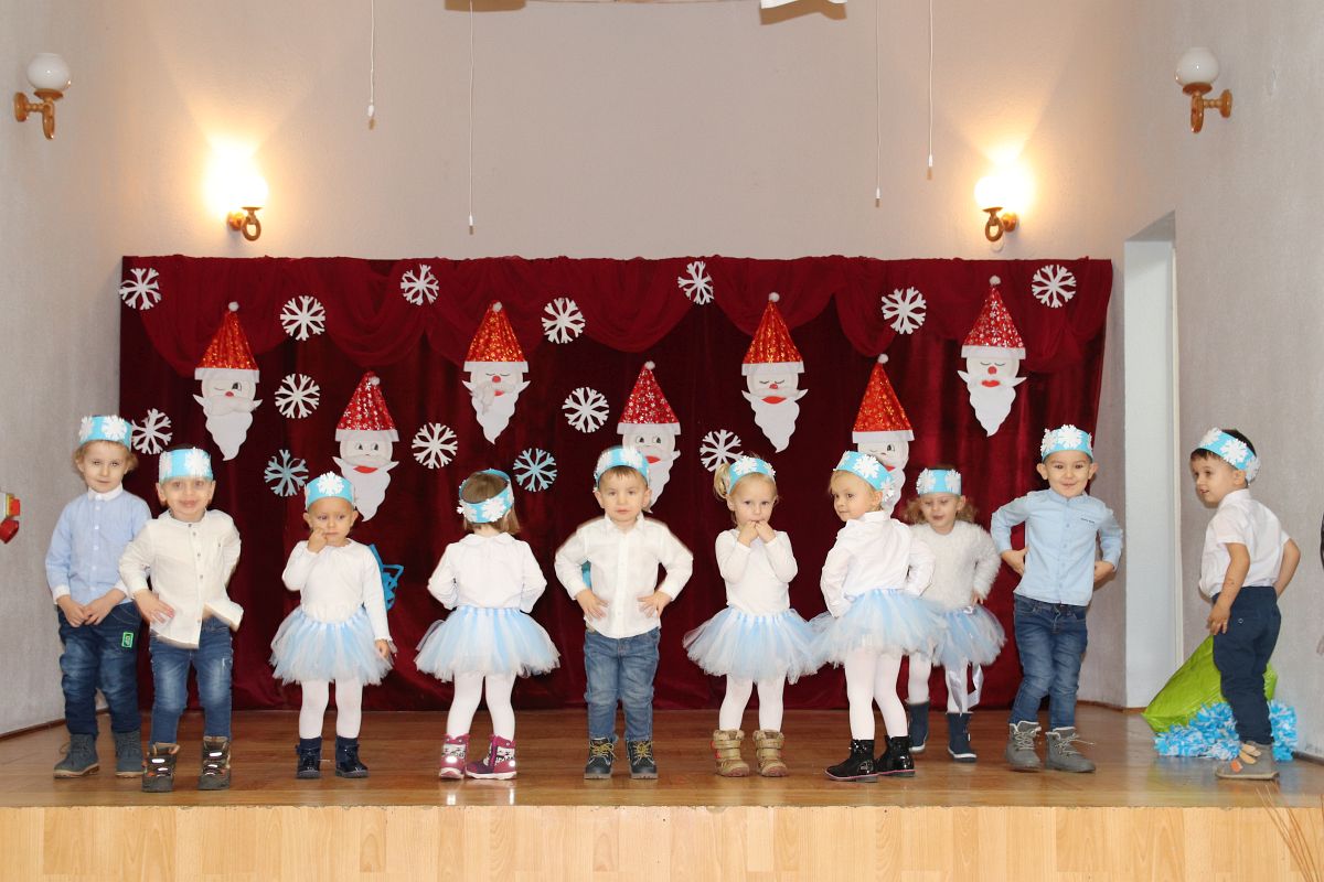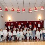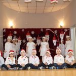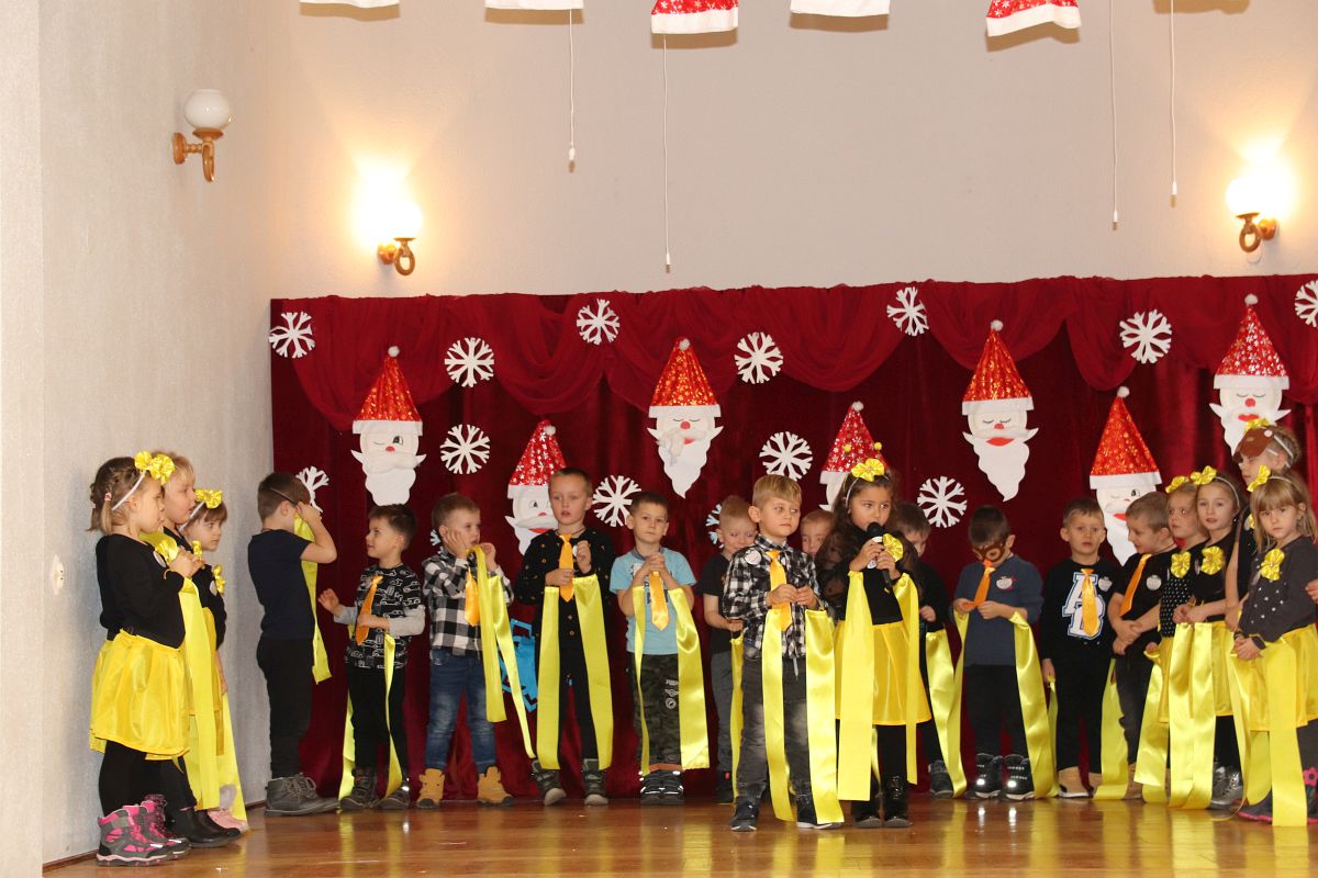 Jako pierwsza wystąpiła grupa „Misie” 2,5-, 3-latków pod kierunkiem Katarzyny Sochy i Agaty Dykta. Dzieci zaprezentowały się nam w montażu śpiewno-muzycznym: „Zimowa piosenka” i „Taniec śnieżynek”. Druga w kolejności wystąpiła grupa „Żabki” 3-latki pod kierunkiem Justyny Wawrzyniak i Agaty Dykta w piosenkach zatytułowanych „Elfy” i „Muzyczne stop”. Grupa „Sówki” były to 4-latki pod kierunkiem Agaty Musielskiej i Magdaleny Czachara. „Sówki” zaprezentowały się w utworach: „ Taniec białych dni” i „Jezus się narodził”. Natomiast Małgorzata Mały i Magdalena Czachara wraz z grupą „Słoneczka” 5-latków zaprezentowała się w tańcu i piosence pod wspólną nazwą „Dzień Bożego Narodzenia”. Grupa „Kotki”, pod kierunkiem Weroniki Iwanickiej i Eweliny Lajter zaśpiewała – piosenki „Święta”, „Hallelujah”oraz „Przyszła zima”. Natomiast grupa „Motylki” pod kierunkiem Moniki Leciejewskiej i Weroniki Iwanickiej zaprezentowała się w piosence i tańcu: „Płatki śniegu” i „Zimowa pałeczka”.