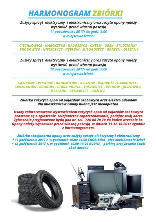 W gminie Rudna rusza jesienna zbiórka elektrośmieci oraz zużytych opon od aut osobowych. Odpady będą zabierane sprzed posesji nieodpłatnie. Szczegóły na plakacie.
