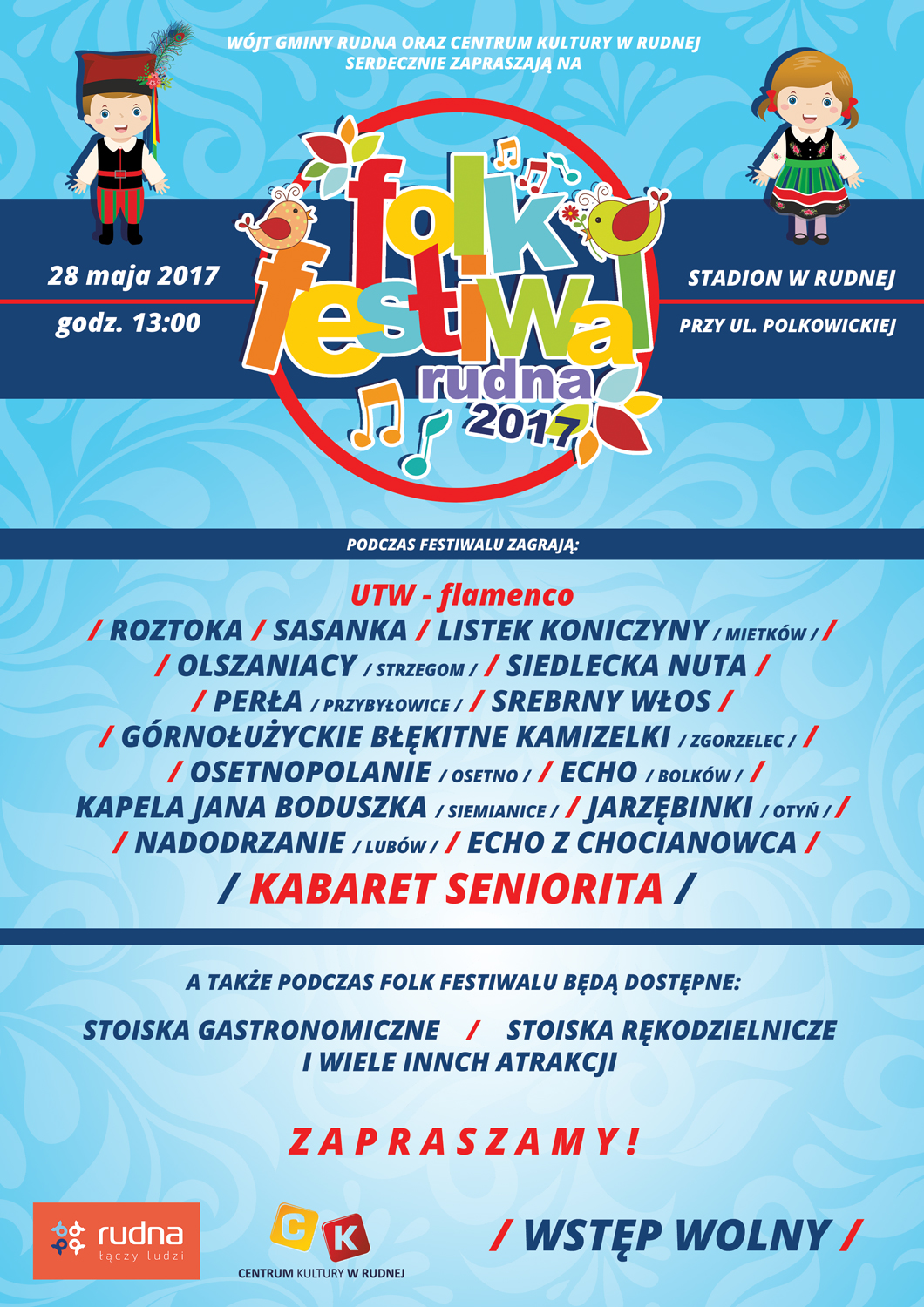 Obok tradycyjnego folkloru organizator imprezy, którym jest Centrum Kultury w Rudnej, przygotował też dodatkowe atrakcje: pokazy tańca flamenco w wykonaniu pilnych studentek Uniwersytetu Trzeciego Wieku w Rudnej oraz występ kabaretu Seniorita. Nie zabraknie również stoisk z rękodziełem i przekąskami.