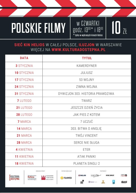 Styczniowe seanse przeniosą widzów w wojenny klimat pierwszej połowy XX wieku. „Dywizjon 303. Historia prawdziwa” przybliży losy polskich lotników, walczących o Anglię w czasie II wojny światowej, a „Kamerdyner” z Januszem Gajosem i Sebastianem Fabijańskim – pokaże poruszającą historię splątanych losów Polaków, Kaszubów i Niemców. Wzruszający dramat „53 wojny” opowie natomiast o korespondencie wojennym i jego żonie, która traci nadzieje, że go jeszcze zobaczy… W styczniu nie zabraknie też znanej z poprzedniej edycji „Zimnej wojny”. Dla rozluźnienia warto się będzie wybrać na bardzo pozytywną komedię „Juliusz” z Wojciechem Mecwaldowskim w roli tytułowej.