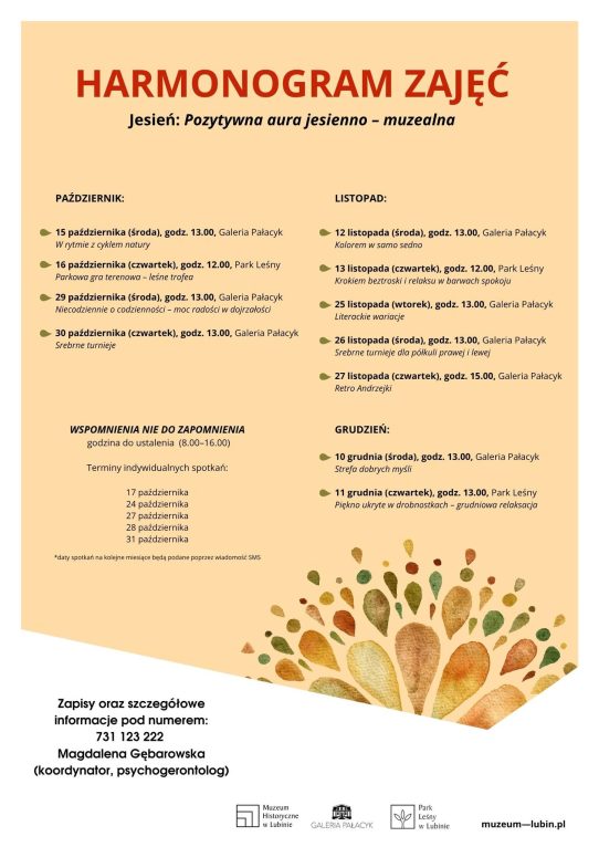 Nowy cykl rusza 15 października spotkaniem wprowadzającym pod hasłem „Pozytywna aura jesienno-muzealna”. W planach znalazły się między innymi plener artystyczny „Barwy jesieni”, spacer edukacyjny „Zielone płuca miasta” i zajęcia artystyczne „Jesienne pejzaże”. Spotkaniom towarzyszą warsztaty z psychogerontologiem, trening pamięci, relaksacja oraz zajęcia rozwijające kreatywność i integrację.
