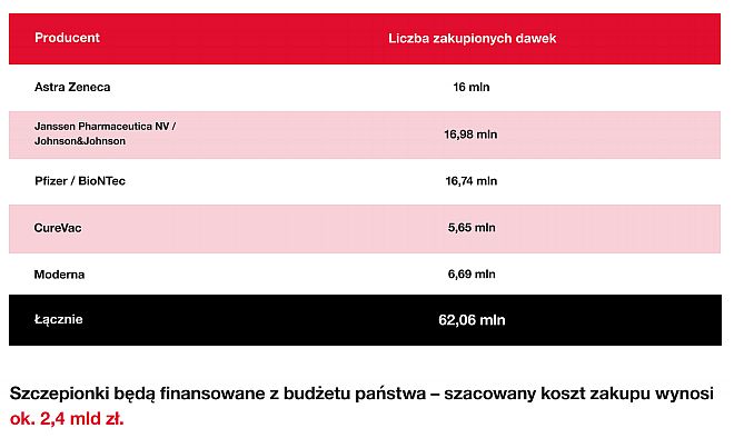Nasz kraj przystąpił do pięciu umów, które zawarła z firmami farmaceutycznymi Komisja Europejska. Na tej podstawie Polacy będą otrzymywać następujące szczepionki: