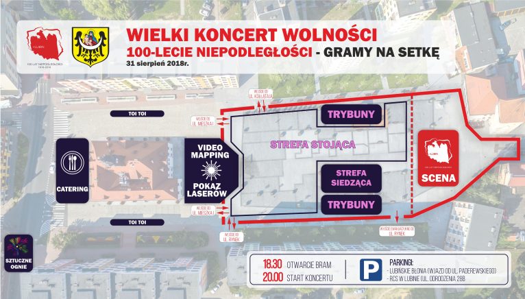 Takiego koncertu lubiński rynek jeszcze nie widział. 100-lecie odzyskania niepodległości, 100 minut muzyki i ponad 100 artystów na ogromnej scenie. A to wszystko już w najbliższy piątek, 31 sierpnia – tego dnia odbędzie się Wielki Koncert Wolności z okazji 36. rocznicy Zbrodni Lubińskiej, połączony ze 100-leciem odzyskania niepodległości. Właśnie ruszył montaż sceny i trybun, a lubiński rynek chwilowo stał się placem budowy.