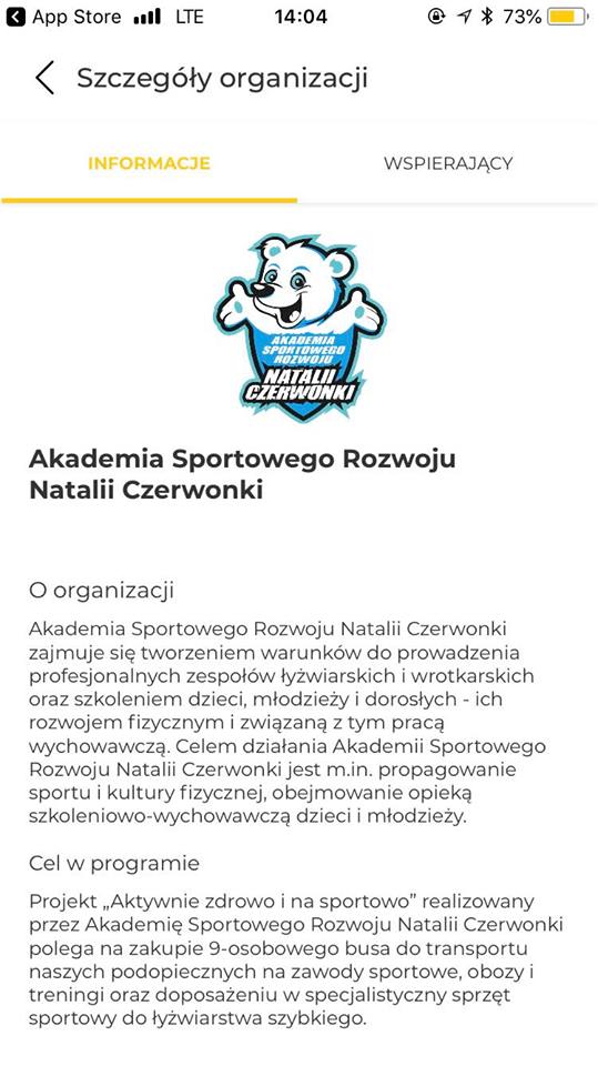 3. Ważne, wybierz organizację, którą chcesz wspierać. Tutaj: Akademia Sportowego Rozwoju Natalii Czerwonki (Akademia SRNT)