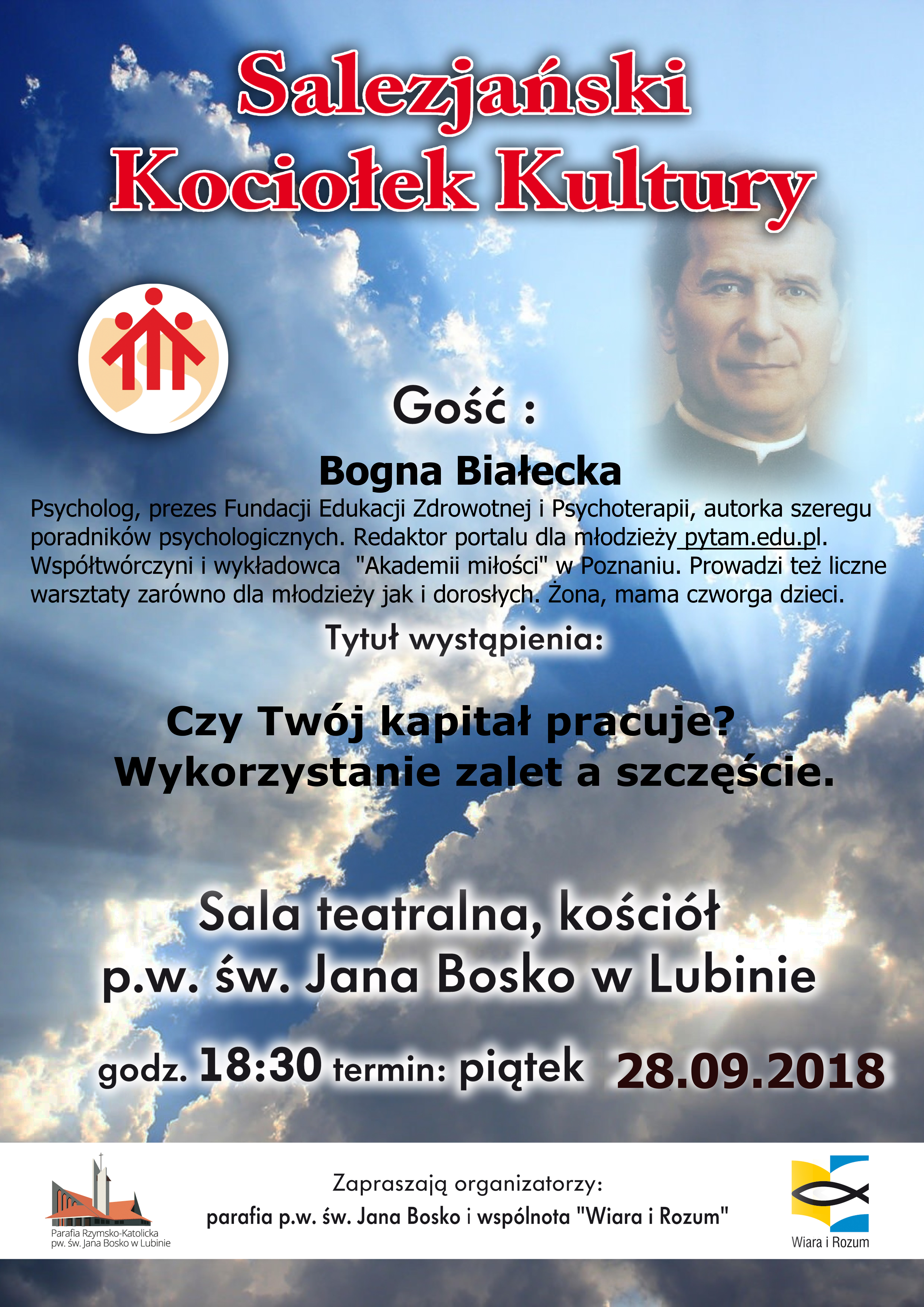 Kolejne spotkanie z cyklu Salezjański Kociołek Kultury. Już w najbliższy piątek, 28 września w kościele św. Jana Bosko w Lubinie gościć będzie psycholog – Bogna Białecka.