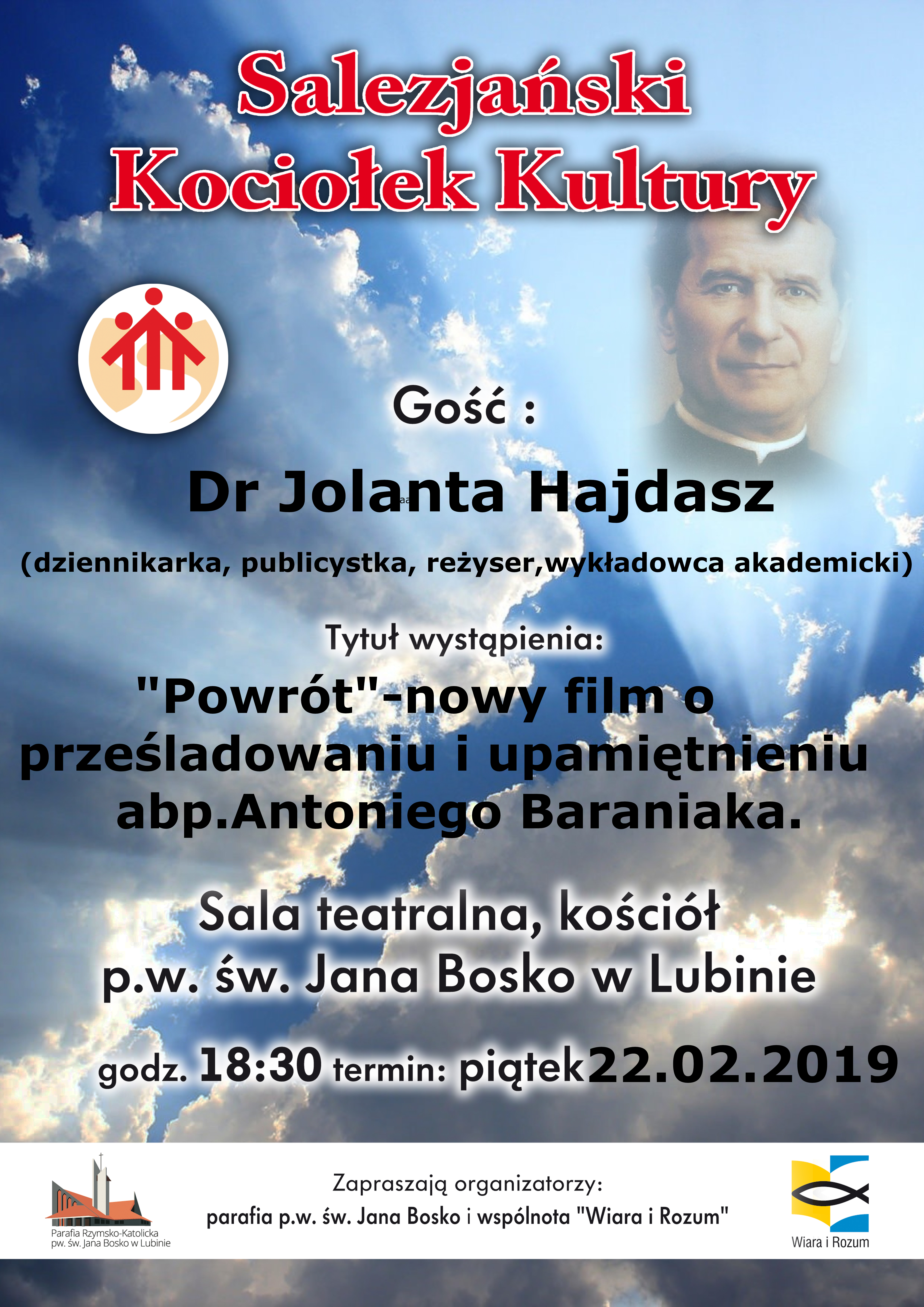 Już na 67 spotkanie z cyklu Salezjański Kociołek Kultury zaprasza parafia św. Jana Bosko w Lubinie. 22 lutego o godzinie 18.30 w piwnicznej salce kościoła pw. św. Jana Bosko, wystąpi z wykładem oraz filmem dr Jolanta Hajdasz, dyrektor Centrum Monitoringu Wolności Prasy Stowarzyszenia Dziennikarzy Polskich, reżyser, publicystka, redaktor naczelna Wielkopolskiego Kuriera „Wnet”.