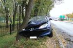 Peugeot na lubińskich numerach rejestracyjnych nagle zjechał z drogi i uderzył w drzewo. Jak mówi kobieta, która go prowadziła, sama nie wie, jak do tego doszło.