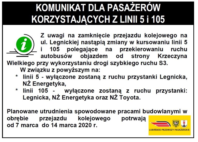 Również żółte autobusy Lubińskich Przewozów Pasażerskich będą kursować zmienioną trasą. 5 i 105 będą jeździć objazdem od strony Krzeczyna Wielkiego przy wykorzystaniu drogi szybkiego ruchu S3.