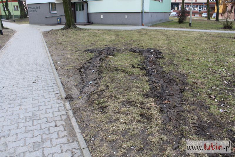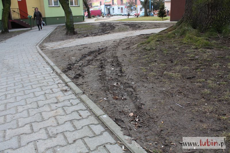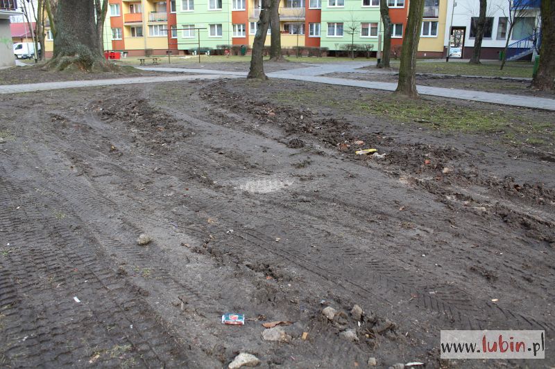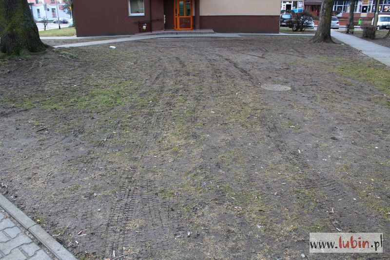 Całe podwórko w błocie, rozjeżdżone przez auta, choć samochody zasadniczo nie powinny tu wjeżdżać. – Trawniki zniszczone, a chodniki zabłocone. W pewnym momencie ciężko było przejść, żeby nie pobrudzić butów czy ubrania. I to w centrum miasta – mówi jeden z lubinian, wskazując na podwórko przy ulicy Tysiąclecia i Kazimierza Wielkiego.