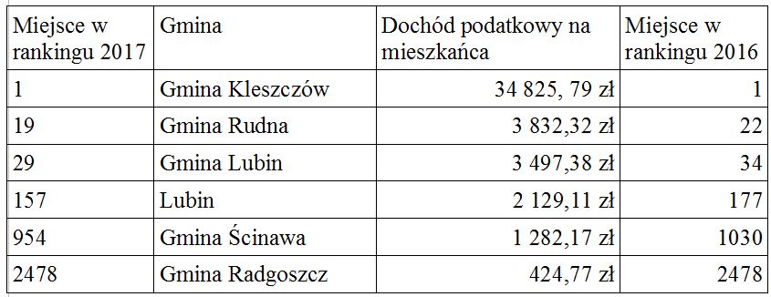 Z rankingu wynika, że w porównaniu z rokiem ubiegłym wzbogaciły się wszystkie gminy naszego powiatu. Rudna awansowała z 22. na 19. miejsce z dochodem 383 2zł na mieszkańca. Wysoko, bo na 29. miejscu znalazła się też gmina Lubin (34. miejsce w 2016). Dochody Ścinawy na poziomie 1282,17 zł uplasowały ją na 954. miejscu (w porównaniu z rokiem ubiegłym to awans o 76 oczek).