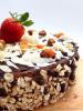 Ciasto udekorowałam polewą z gorzkiej czekolady (roztopiona w kąpieli wodnej, 3 tabliczki czekolady), mieszanką suszonych owoców (ananas płatki kokosowe papaja), posiekanymi migdałami oraz musli z czekoladą.