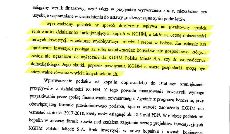 W podobnym tonie wypowiadał się goszczący w zeszłym roku w KGHM minister energii Krzysztof Tchórzewski: – Moje osobiste przekonanie jest takie, że ten podatek jest potrzebny, ale z drugiej strony wydaje mi się – osobiście, to podkreślam – że błędem jest to, iż nie stanowi on kosztów uzyskania przychodu i w ten sposób ciąży na spółce i załodze. Jeżeli nawet byśmy go zostawili, to trzeba go poprawić – mówił.