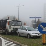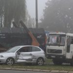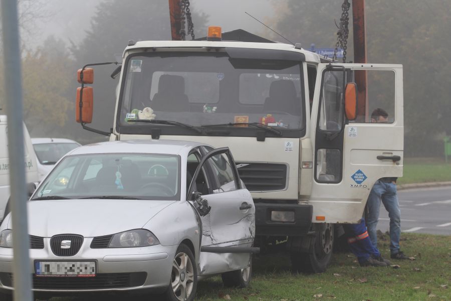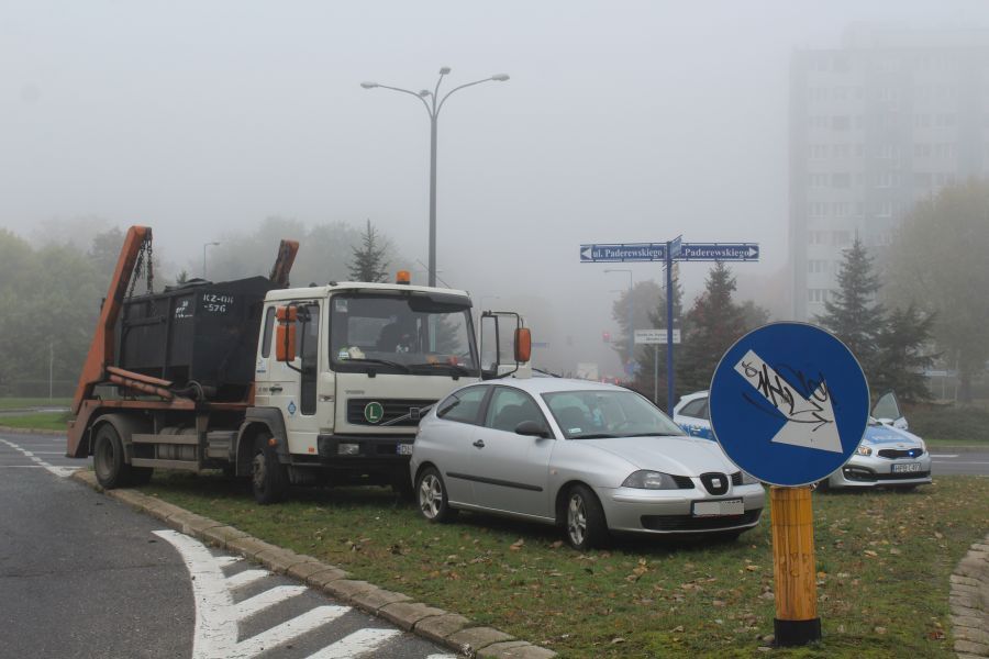 Pośpiech czy nieuwaga były powodem dzisiejszej kolizji? Na rondzie im. Pamięci Ofiar Zbrodni Lubińskiej zderzyły się osobowy seat i wiozący śmieci tzw. bramowiec Miejskiego Przedsiębiorstwa Oczyszczania.
