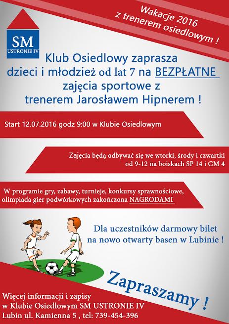 Już 12 lipca ruszą pierwsze zajęcia sportowe dla dzieci powyżej 7. roku życia i młodzieży. Poprowadzi je osiedlowy trener, Jarosław Hipner, który na co dzień jest nauczycielem wychowania fizycznego w Gimnazjum nr 4 w Lubinie. Spotkania będą odbywać się we wtorki, środy i czwartki od godziny 9 do 12. Uczestnicy – nie muszą to być tylko mieszkańcy Ustronia IV – wezmą udział w grach, zabawach i olimpiadach z nagrodami. Za udział w zajęciach nie trzeba nic płacić. Więcej informacji i zapisy pod numerem telefonu 739 454 396.