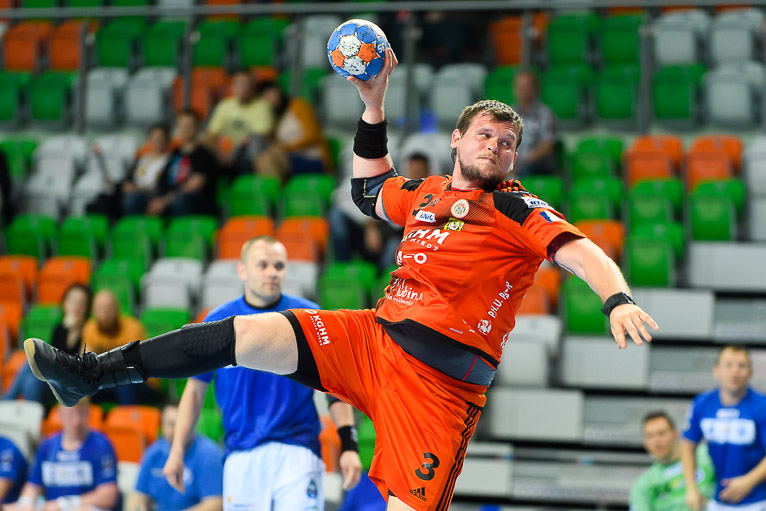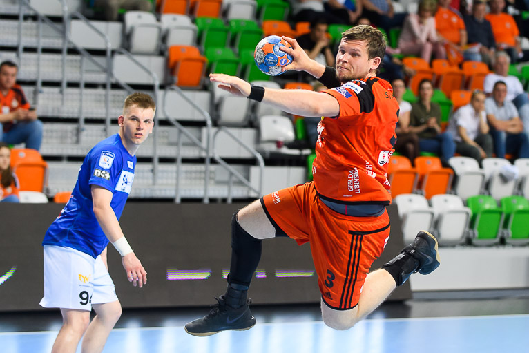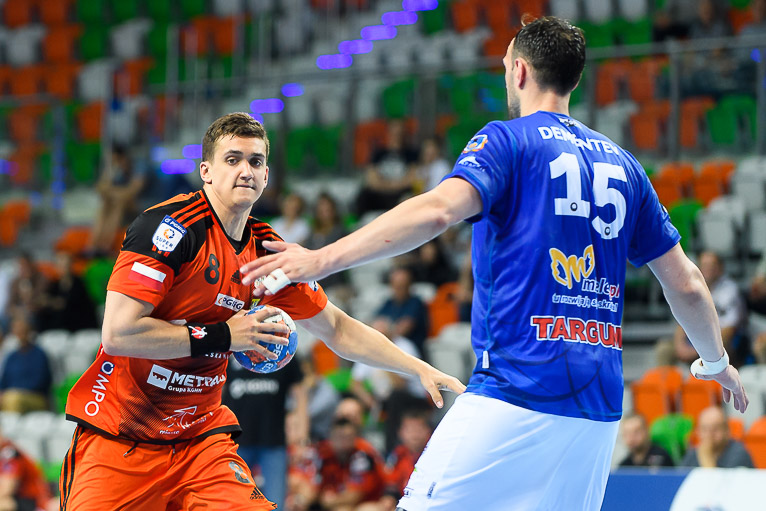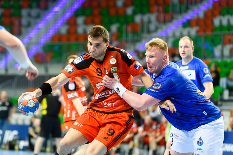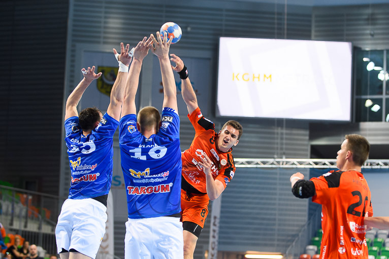 Po wyrównanym początku i grze bramka za bramkę w dziesiątej minucie Stal odskoczyła trzy trafienia – 4:7. Po kwadransie i trafieniu Rafała Krupy było 5:9 i czas dla swojej drużyny wziął Paweł Noch. Słowa szkoleniowca podziałały na miedziowych na tyle, że sukcesywnie zaczęli zmniejszać straty. W 24. minucie kontaktową bramkę ze skrzydła zdobył Jan Czuwara. W końcówce pierwszej połowy goście znów odskoczyli i tę część spotkania wygrali 17:13.