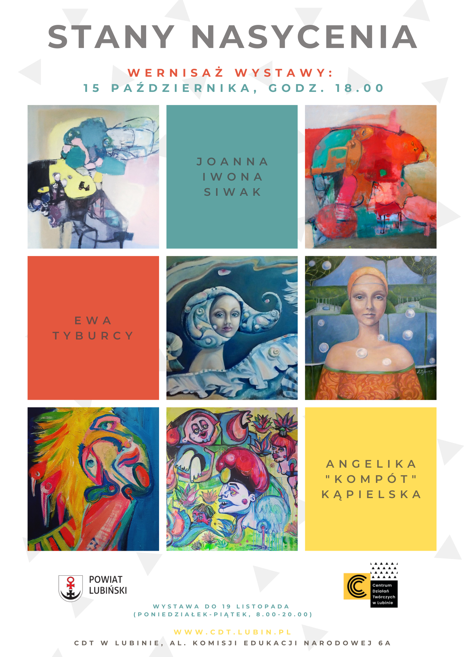 Ekspozycję tworzą prace trzech artystek, dla których sztuka to możliwość odkrywania i wyrażania siebie. Poszukiwanie formy, kształtu i koloru to droga każdego artysty… Mamy szansę zobaczyć, jak różnorodna może być. Wystawa „Stany nasycenia” daje niepowtarzalną możliwość zajrzenia do trzech, bardzo odrębnych światów artystycznych, do których zapraszają: Joanna Siwak, Ewa Tyburcy i Agnelika „Kompót” Kąpielska.