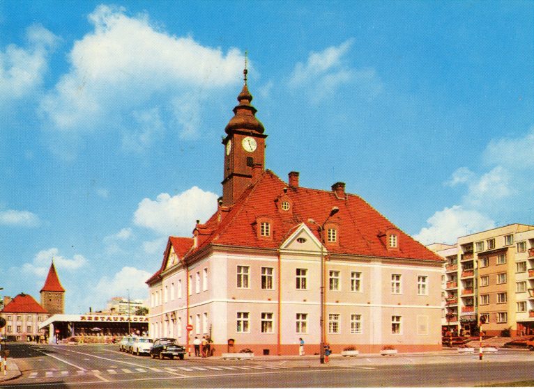 Plac Wolności – nowa nazwa dawnego Rynku – widok na ratusz od strony południowej. Obecnie w miejscu kwiecistych klombów stoją nowe „stare” kamieniczki południowej pierzei Rynku.