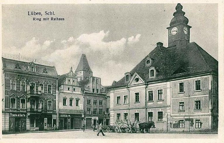 Ratusz lubiński widoczny z wylotu Liegnitzerstrasse (obecnie ul. Piastowska). Na parkingu przed ratuszem „zaparkowane” dwie furmanki. Po lewej stronie pocztówki fragment pierzei zachodniej, która została niemal doszczętnie zniszczona w trakcie walk o miasto w lutym 1945 roku.