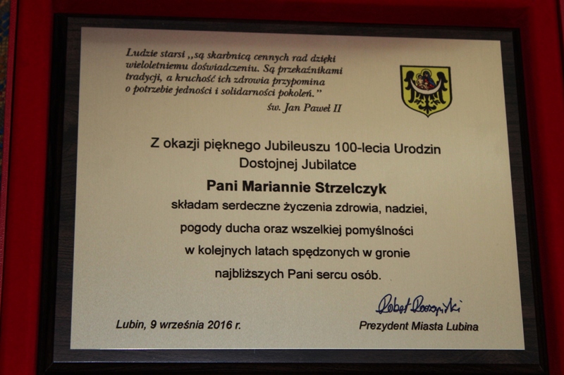 Z okazji setnych urodzin wizytę złożyli przedstawiciele magistratu. Jubilatka otrzymała bukiet kwiatów oraz list gratulacyjny od prezydenta Roberta Raczyńskiego.