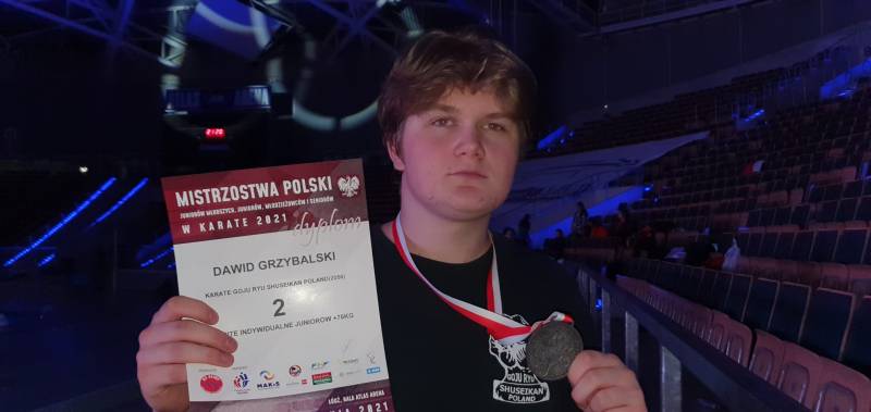 Dawid Grzybalski, który wywalczył srebrny medal zostając wicemistrzem Polski w konkurencji kumite indywidualnym Juniorów 16-17 lat +75 kg. Dawid na co dzień trenuje w Ścinawskim Klubie Karate Goju Ryu, gdzie zajęcia odbywają się w Szkole Podstawowej, a trenerem Dawida jest Przemysław Trubicki.