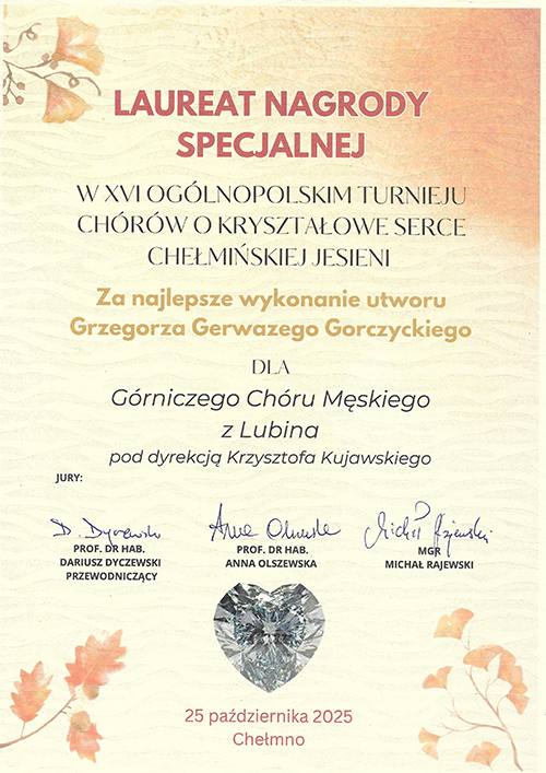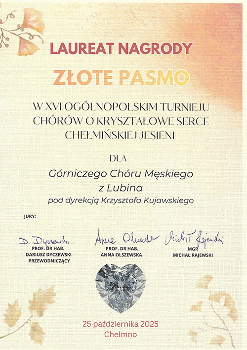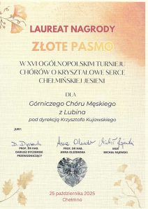 W konkursie wzięło udział siedem chórów, a poziom artystyczny prezentowanych utworów był niezwykle wysoki. Górniczy Chór Męski zdobył „Złote Pasmo” oraz Puchar Prezesa Polskiego Związku Chórów i Orkiestr, a także dwie nagrody specjalne: za najlepsze wykonanie utworu o tematyce sakralnej „Pater Noster” Piotra Jańczaka oraz za najlepsze wykonanie kompozycji Grzegorza Gerwazego Gorczyckiego „Sepulto Domino”. Te wyróżnienia są dla zespołu ogromnym zaszczytem i potwierdzeniem, że ich praca i pasja mają głęboki sens.