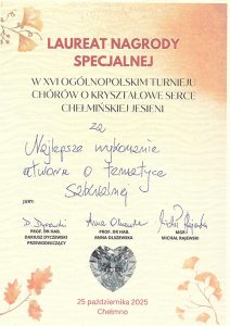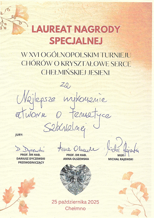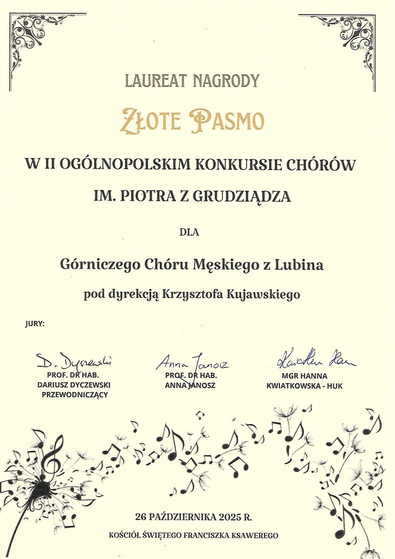 Chór zdobył też „Złote Pasmo” w II Ogólnopolskim Konkursie Chóralnym im. Piotra z Grudziądza. Przesłuchania konkursowe odbyły się w zabytkowym kościele pw. św. Franciszka Ksawerego, którego barokowy ołtarz stanowił majestatyczne tło dla prezentacji muzycznych. Wykonania oceniało jury w składzie: prof. dr hab. Dariusz Dyczewski, przewodniczący, prof. dr hab. Anna Janosz oraz mgr Hanna Kwiatkowska-Huk – osoby o ogromnym autorytecie i doświadczeniu w dziedzinie chóralistyki.