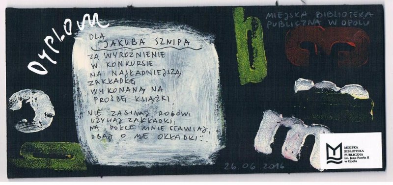 Niespodziankę miał również uczeń tej samej klasy Jakub Sznip. Jego pracę wyróżniono na Ogólnopolskim Konkursie „Zakładka wykonana na prośbę książki”. Pasje Kuby to czytanie oraz turystyka.