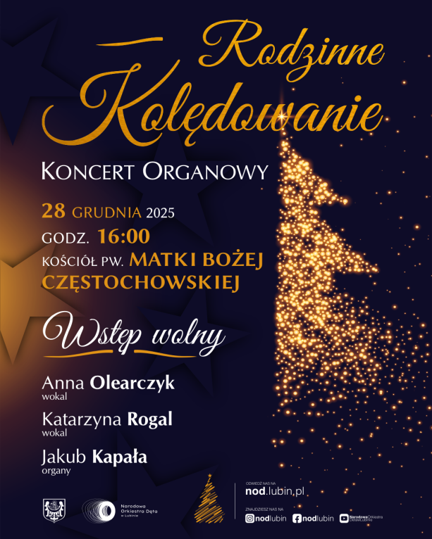 W grudniu będzie jeszcze jednak szansa, by wybrać się na koncert organizowany przez NOD. Tuż po świętach, 28 grudnia w kościele pw. Matki Bożej Częstochowskiej odbędzie się Rodzinne Kolędowanie. Tego popołudnia z akompaniamentem zabytkowych organów zabrzmią najpiękniejsze kolędy i pastorałki. Zaśpiewają wokalistki: Anna Olearczyk i Katarzyna Rogal, a na organach zagra Jakub Kapała. Koncert rozpocznie się o godz. 16. Wstęp jest bezpłatny.