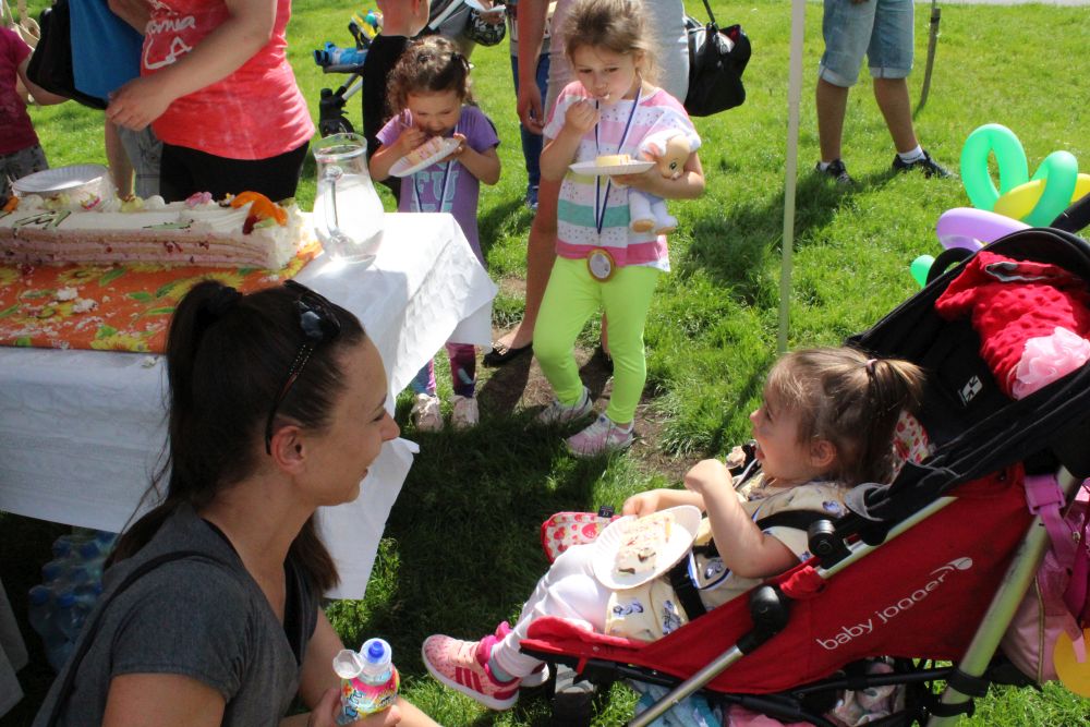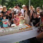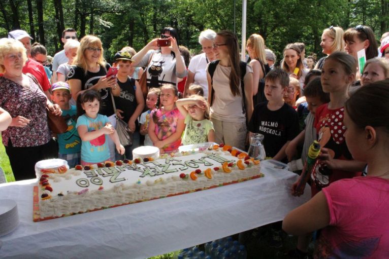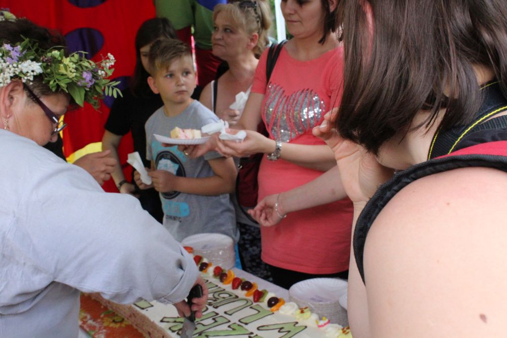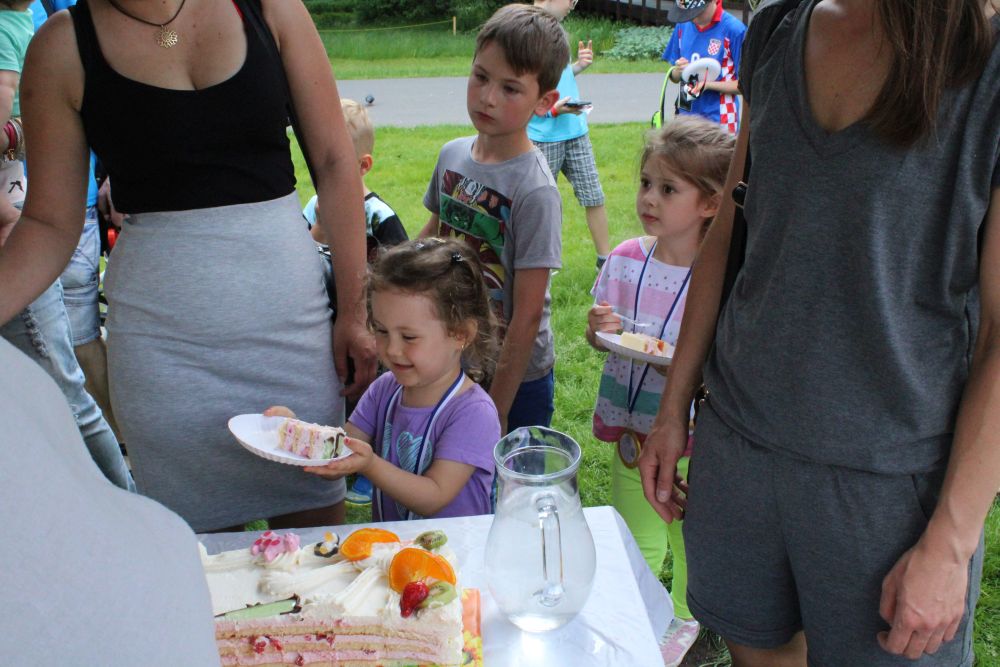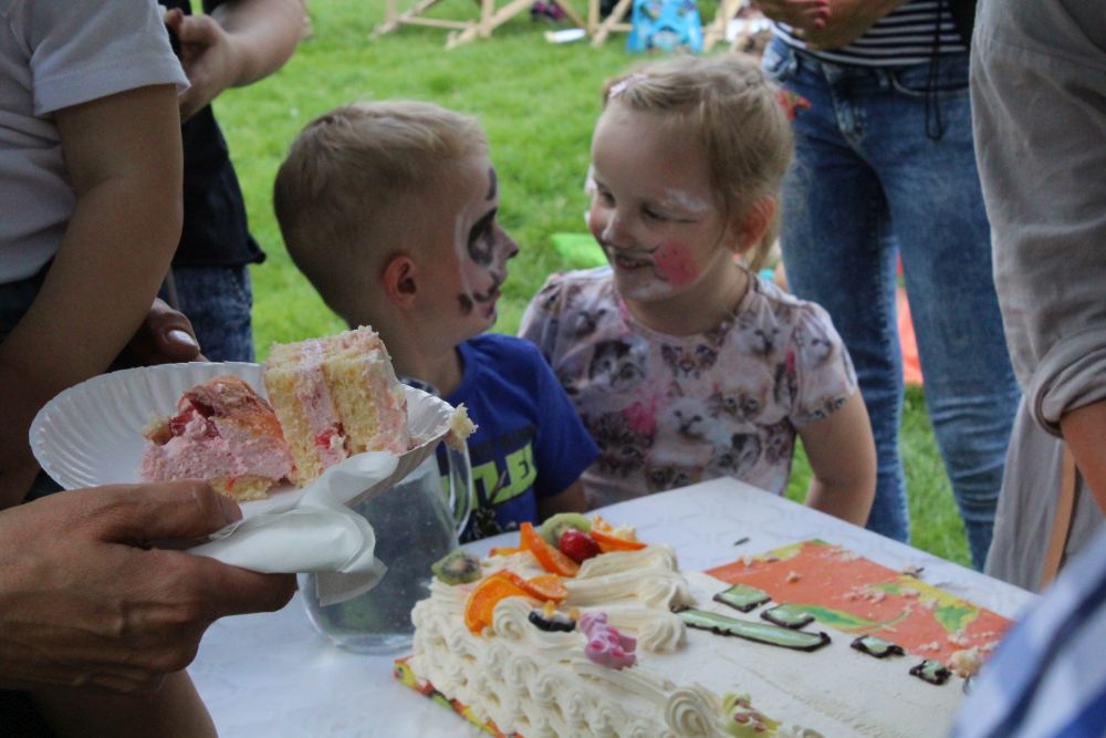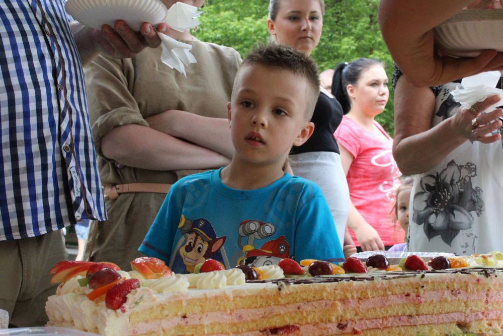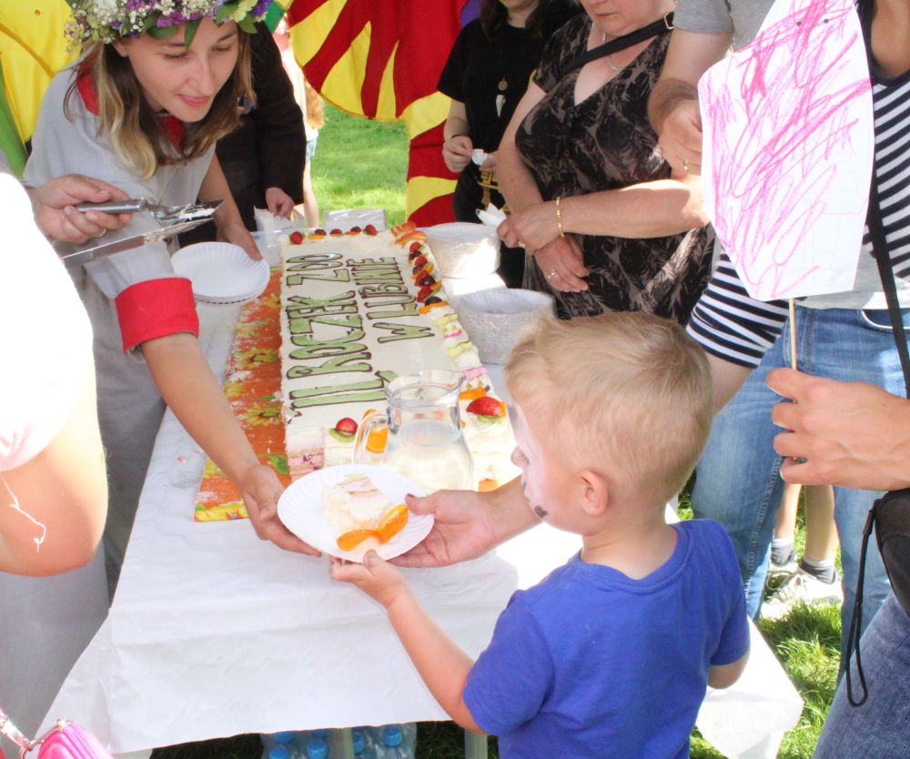 Truskawkowo-śmietankowy urodzinowy tort zniknął w jednej chwili, choć był całkiem spory – ważył 21 kilogramów. Dzieciom bardzo smakował, co słychać było z każdej strony. Dorośli też chętnie się częstowali.