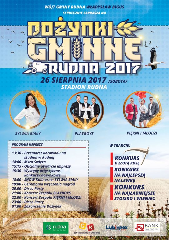 Święto plonów rozpocznie się w sobotę, 26 sierpnia, przemarszem korowodu na stadion w Rudnej. Po mszy świętej i oficjalnym otwarciu będą występy artystyczne i konkursy dożynkowe – o złotą kosę, na najlepszą nalewkę, najładniejsze stoisko i wieniec dożynkowy.
