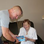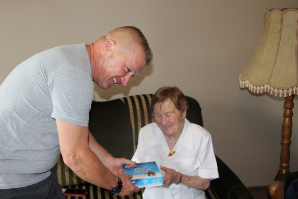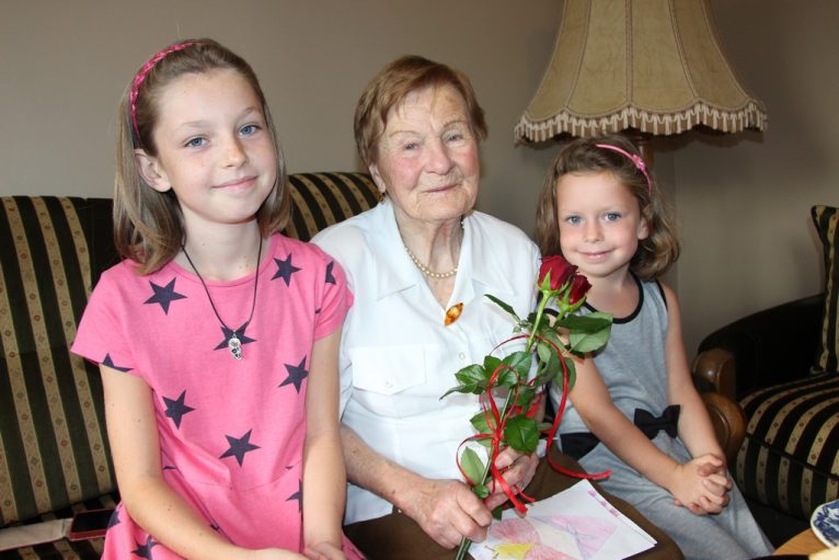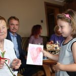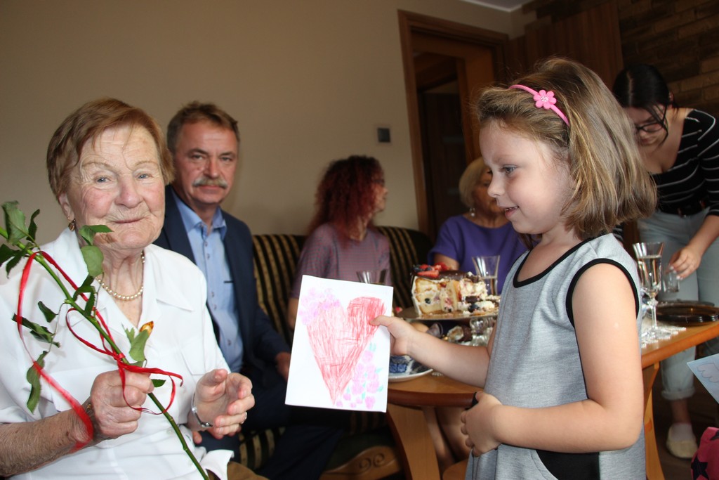Z okazji urodzin prababci – prawnuczki Ala i Oliwia przyniosły własnoręcznie wykonane laurki.