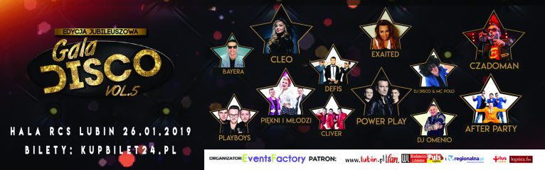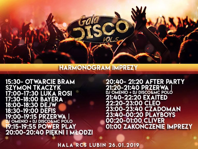 Na scenie ustawionej w hali dla wielbicieli disco polo wystąpi czternastu artystów. Niektórzy gościli już wcześniej w Lubinie, innych będzie można usłyszeć i zobaczyć po raz pierwszy. Zagrają: Cleo, Zespół After Party, Czadoman, Piękni i Młodzi, Zespół Muzyczny DEFIS, Cliver, Playboys, PowerPlay, Exaited, Dejw, Bayera, Luka Rosi, Dj Disco&McPolo, Dj Omenio. Podczas tej edycji usłyszymy również mieszkańca naszego regionu Szymona Tkaczyka z utworem „Teresa”.