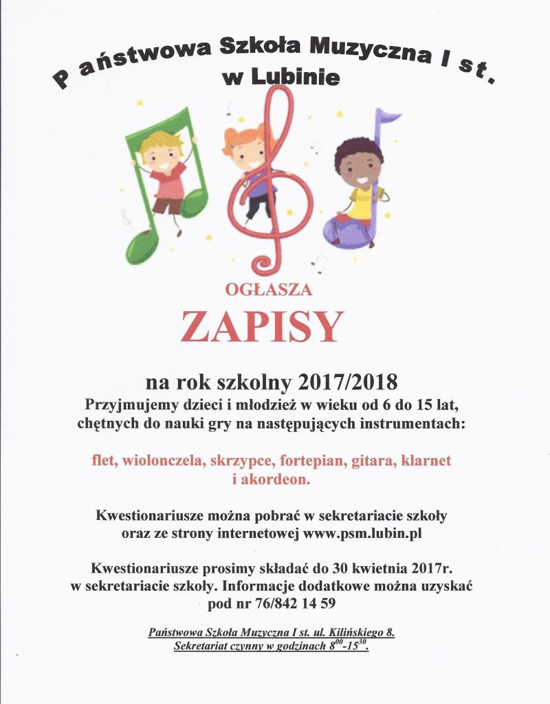 Właśnie trwa nabór na rok szkolny 2017/2018. Osoby, które chciałyby nauczyć się grać na skrzypcach, akordeonie, wiolonczeli, flecie, klarnecie, fortepianie lub gitarze, powinny wypełnić kwestionariusz, który można znaleźć na stronie szkoły www.psm.lubin.pl i dostarczyć go do sekretariatu szkoły do 30 kwietnia.